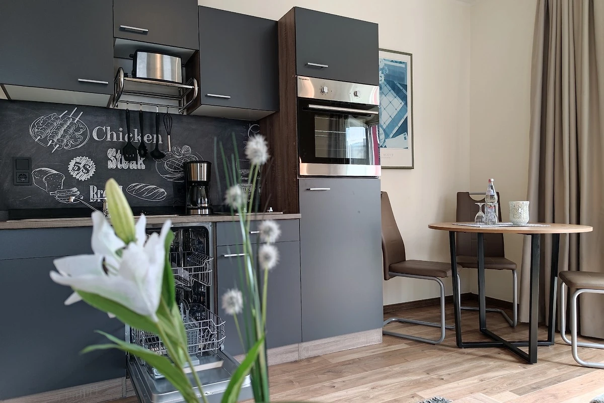 Die im Wohnzimmer befindliche Küche mit Essecke beherbergt ein Ceranfeld, Backofen, Spülmaschine, Kühlschrank mit Kuhl-/ Gefrier Kombi sowie eine Mikrowelle, Kaffeemaschine, Wasserkocher, Toaster und Eierkocher. Weiterhin stehen Ihnen natürlich Kochutensilien wie Töpfe und Pfannen zur Verfügung.