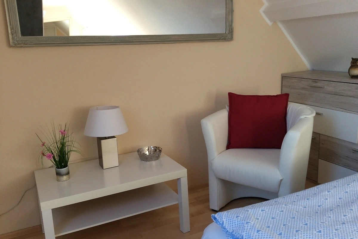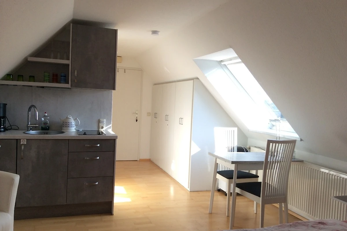 Die Ferienwohnung mit Dachschrägen hat eine Grundfläche von 27,5 m². Sie ist in diesem Jahr neu ausgestattet worden mit ansprechenden Möbeln und einer neuen Küche mit Geschirrspüler. Die Ferienwohnung ist so ausgestattet, dass eine Selbstversorgung gut möglich ist. Zur Wohnung gehört ein kleines Duschbad, Einbauschränke und ein Vorraum, der zum Abstellen von Gepäck genutzt werden kann. Bei Bedarf steht in Absprache mit dem Vermieter in einem separaten Raum im Erdgeschoss auch eine Waschmaschine und ein elektrischer Wäschetrockner zur Verfügung. Die Gäste können auf einer kleine separaten vor Blicken geschützten Terrasse am Haus gerne abends bei einem Glas Wein den Tag ausklingen lassen oder auch dort das Frühstück einnehmen.