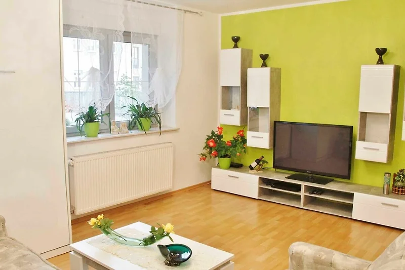 Das gemütliche Wohnzimmer erzeugt eine warme Ausstrahlung durch eine grün gemalerte Wand, die hellen Möbel runden das Gesamtbild ab und sorgen so für ein angenehmes Raumgefühl. Zur Einrichtung gehört eine moderne Anbauwand,ein 3-Sitzer mit Sessel, Couchtisch sowie ein Schrankbett. Dieses ist 1,60m x 2m gross und dient für 2 weitere Schlafplätze.