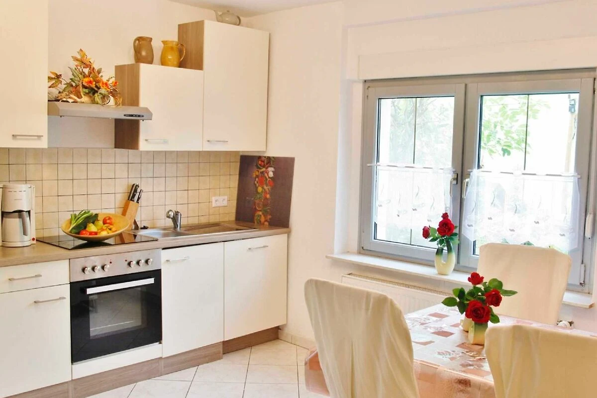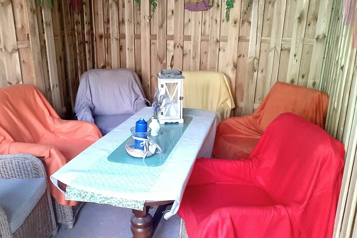 Die Wohnküche ist mit einer kompletten Küchenzeile eingerichtet. Zur Ausstattung gehören ein Kühlschrank mit Gefrierfach, Spülmaschine, Herd, Mikrowelle, Kaffeemaschine, Toaster und ein Eierkocher. Eine Sitzecke für 4 Personen, abgestimmt in hellrosé Farbton und mit Glitzer-Effekt gehört zur Einrichtung.