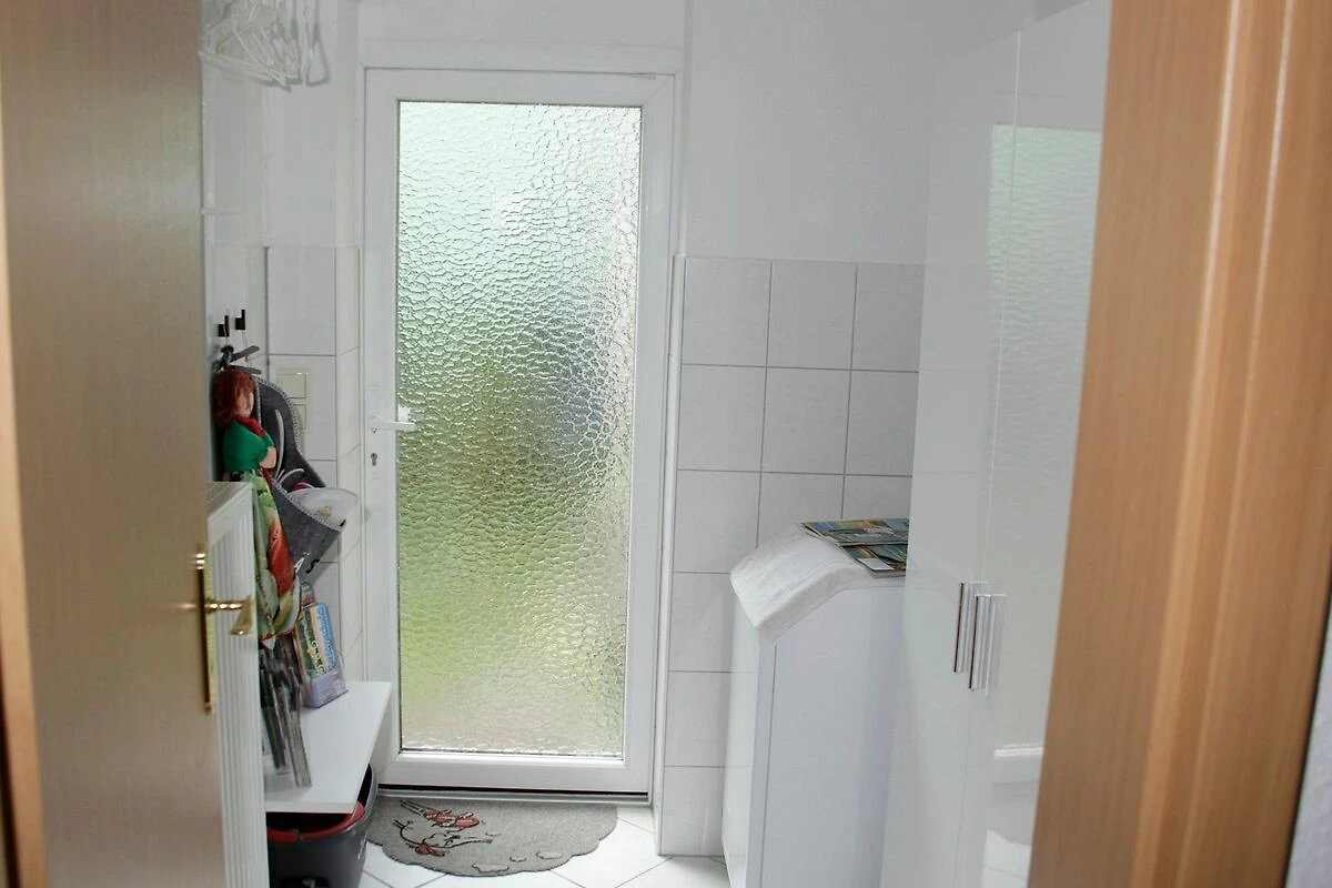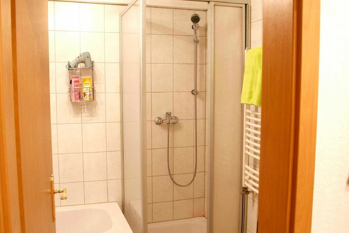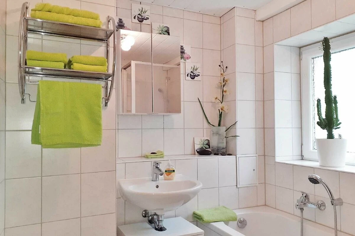Das Bad ist mit einer Badewanne sowie einer Dusche und WC ausgestattet. Im Beckenschrank finden Gäste Reinigungsmittel zur Verwendung. Ein Spiegelschrank, Badehandtücher, Gästetücher, Fön und eine Antirutschmatte für die Dusche liegen den Gäste bereit.