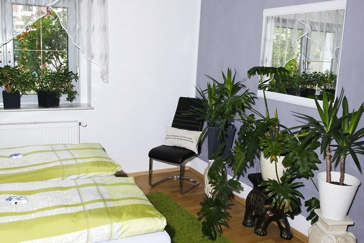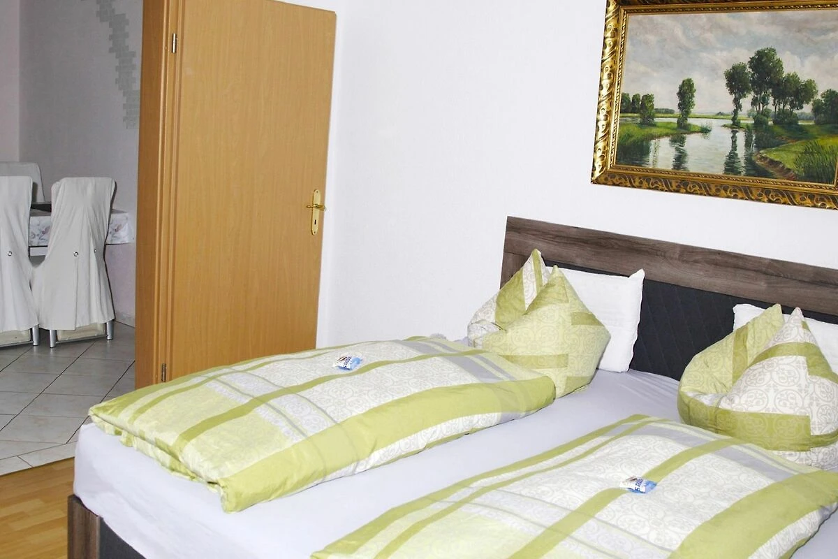 Im Schlafzimmer finden Gäste ein Doppelbett mit Nachtschränken, eine Kommode mit Spiegel sowie einen Ganzkörperspiegel, 2 helle Stühle und ein grüner Teppich rundet das Zimmer ab. Auch die grau glitzernde tapezierte Wand dient für ein gemütliches Wohlbefinden.