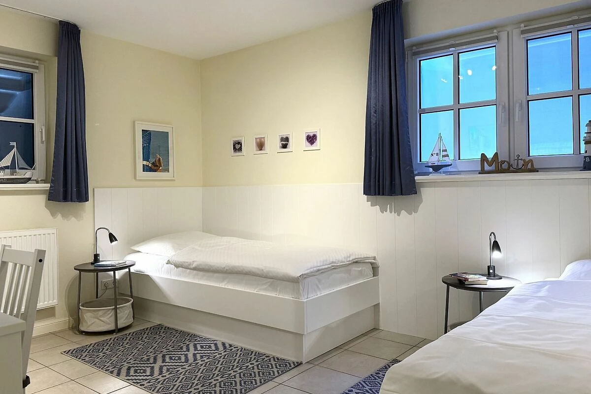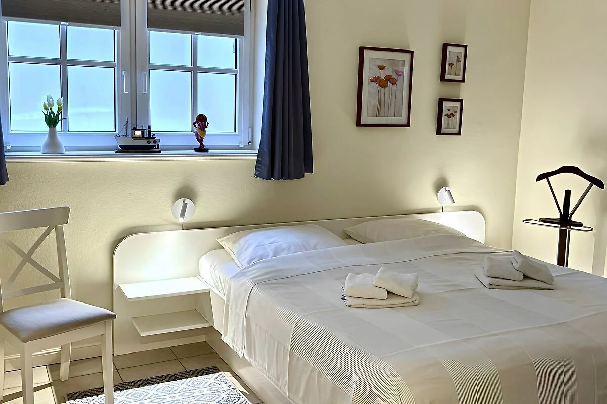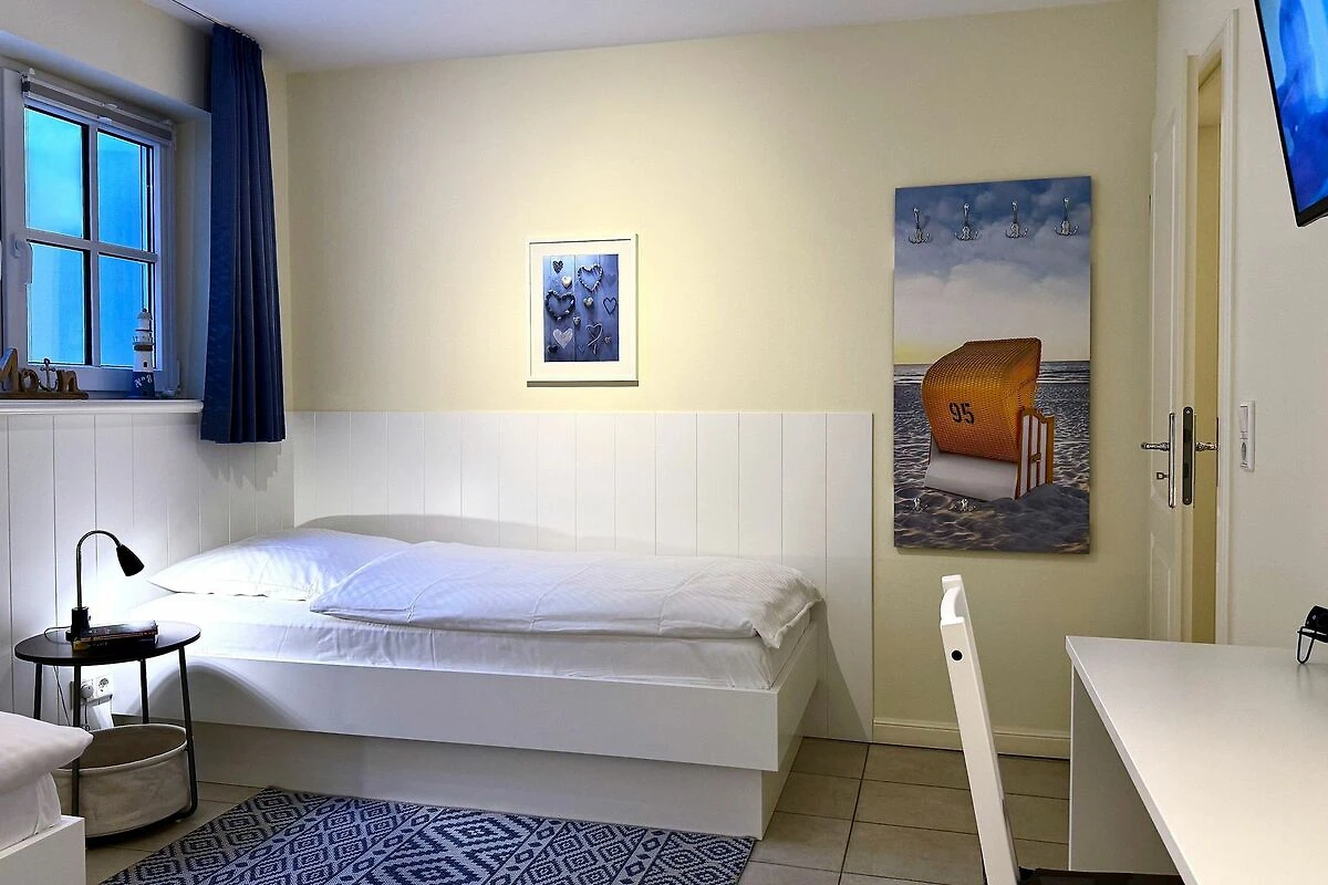 Herzlich Willkommen in unserem ruhig gelegenen, exklusiven Appartement. Die hochwertige Möblierung sowie die grosszügig geschnittenen, lichtdurchfluteten Räume kennzeichnen diese aussergewöhnliche Ferienwohnung. Das Haus mit 4 Wohnungen steht in unmittelbarer Nähe vom Südstrand in Wyk. Von der geschützt liegenden, grosszügigen Südterrasse geniessen Sie den Blick auf das kleine Wäldchen und die Atmosphäre der unmittelbar dahinter liegenden Nordsee. Während Sie gemütlich bei einem Glas Wein im Strandkorb den schönen Tag ausklingen lassen, toben Ihre Kinder im eigenen Garten. Abends oder bei Schietwetter machen Sie es sich am Kaminofen gemütlich oder entspannen sich in der eigenen Infrarotsauna und tanken mal wieder auf! Ein Appartement mit hohem Komfort.