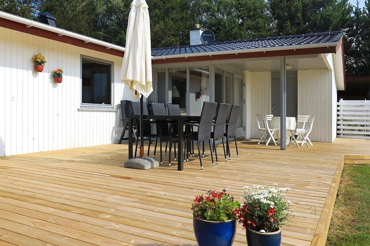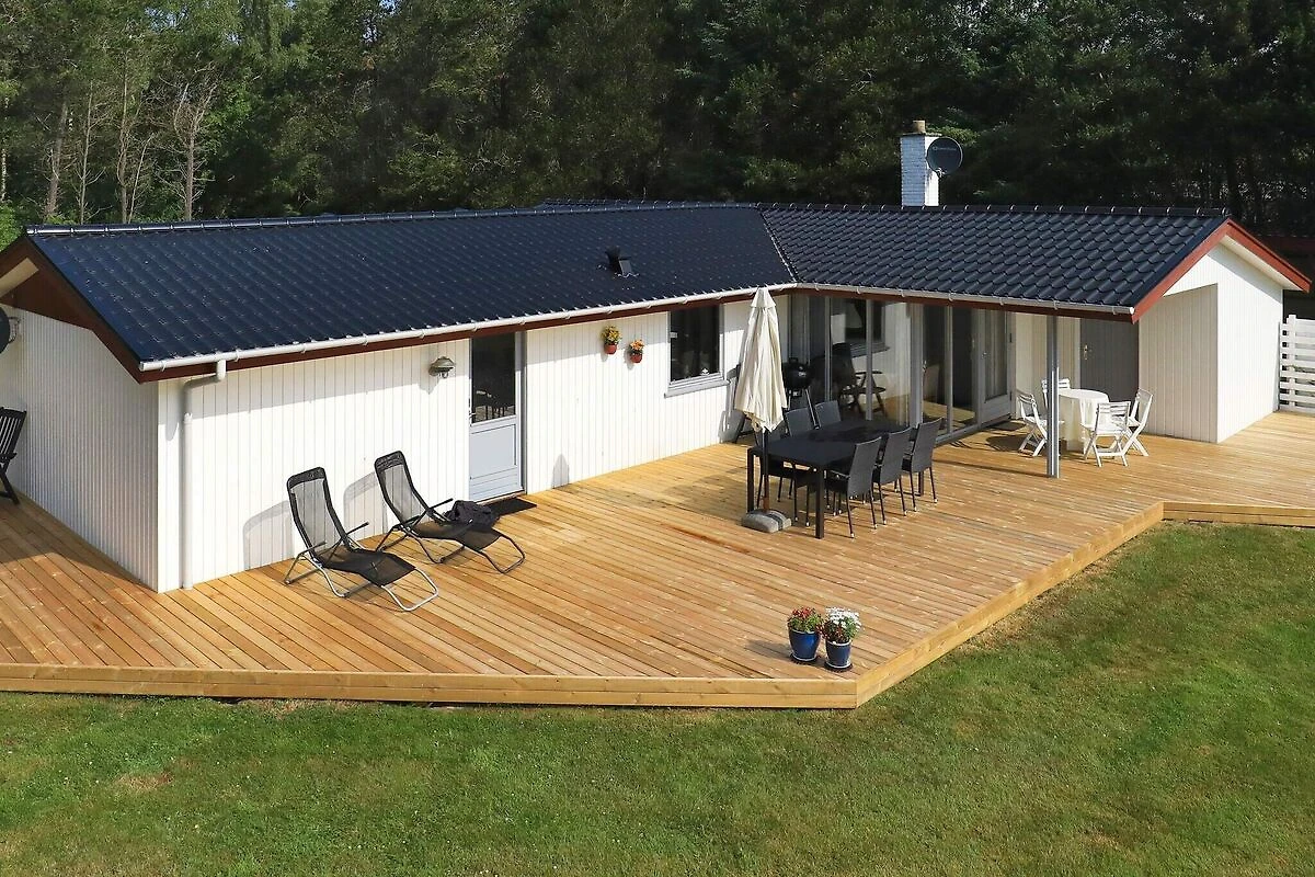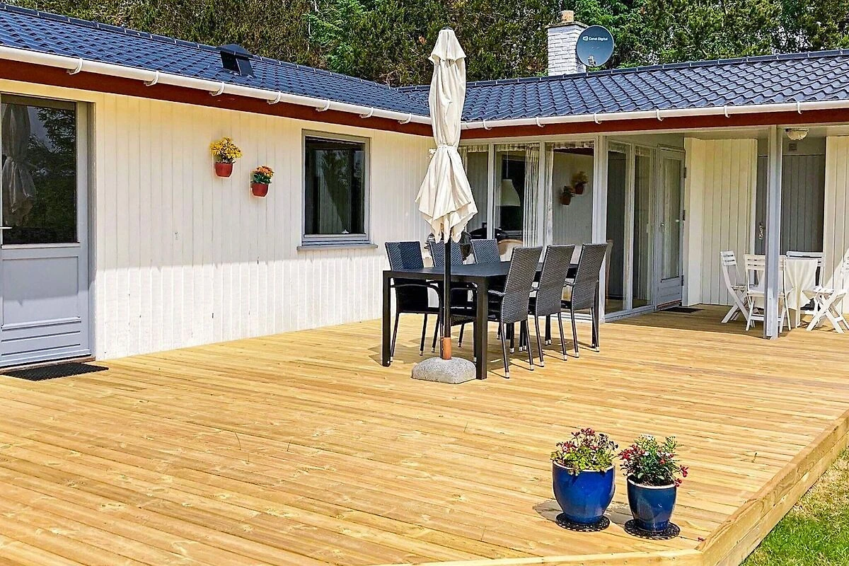 Ferienhaus mit schöner, großer Sonnenterrasse und attraktiver Lage auf einem großen, sonnigen Naturgrundstück etwa 1 km von Meer und Strand entfernt. Das Haus ist hell und wohnlich eingerichtet und hat drei Schlafzimmer mit Stauraum. Geräumiges Badezimmer und praktische Gästetoilette direkt neben dem kleinen Schlafbereich. Gut ausgestattete Küche in offener Verbindung zum Wohnzimmer mit Blick ins umliegende Grün, wo Rehe und Hasen zu Hause sind. Schöne Holzterrasse am Haus auf der Sie die Mahlzeiten genießen können. Nebenan auf dem Rasengrundstück steht ein kleiner, ganzjährig isolierter Annex mit einer Schlafcouch für zwei Personen. Auf dem Naturgrundstück befindet sich direkt neben der Terrasse und dem Anbau zudem ein kleiner Gartenteich mit Goldfischen. Keine Vermietung an Jugendgruppen erwünscht!
