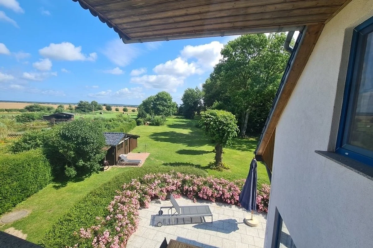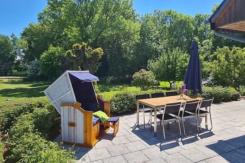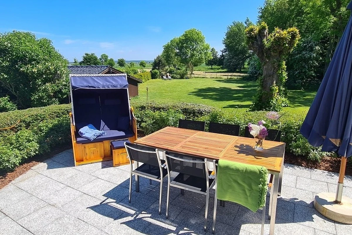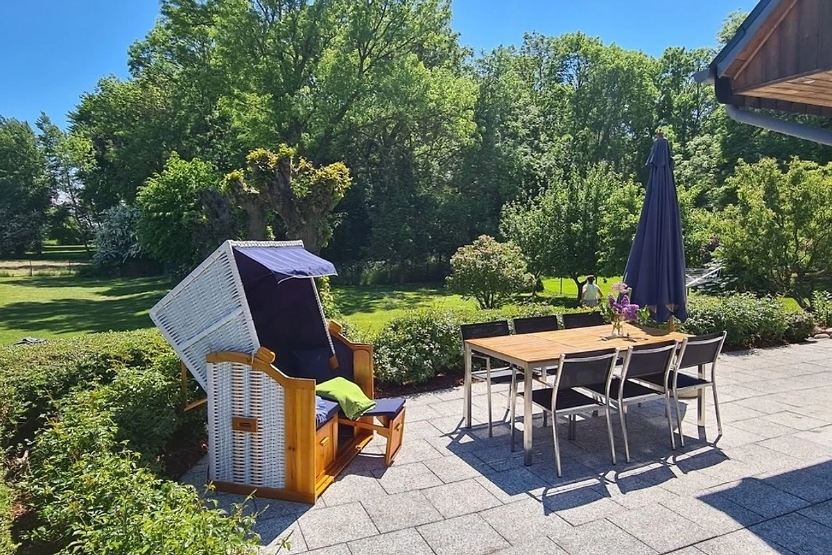 grosse private Sonnenterrasse Ausrichtung S/O mit Blick auf den Bodden, Strandkorb, Gartenmöbeln und Grill