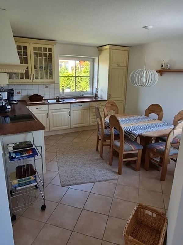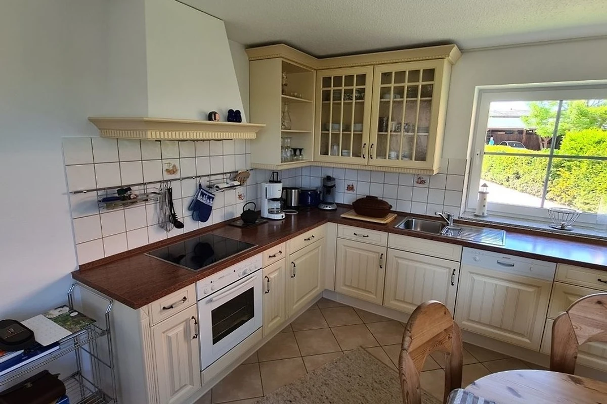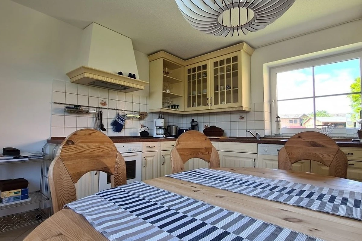 voll ausgestattet mit Spülmaschine, Kühlschrank mit Gefrierfach, Herd, Ofen, Wasserkocher, Kaffeemaschine, Toaster, Mixer, Waffeleisen, Esstisch mit 6 Stühlen