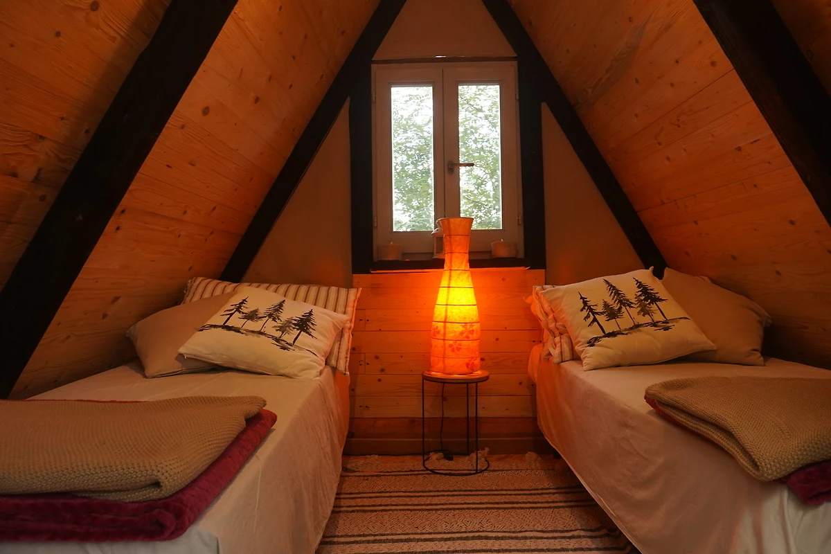 Die Villa erstreckt sich über zwei Ebenen. Im Erdgeschoss befindet sich ein großer offener Raum mit Küche, Esstisch und Ruhebereich mit dekorativem Kamin, kleinem Schrank und WC mit Wäscherand. Eine Treppe führt in die obere Etage, die aus zwei Doppelzimmern, einem Vierbettzimmer mit Etagenbett und einem Badezimmer mit Dusche besteht.