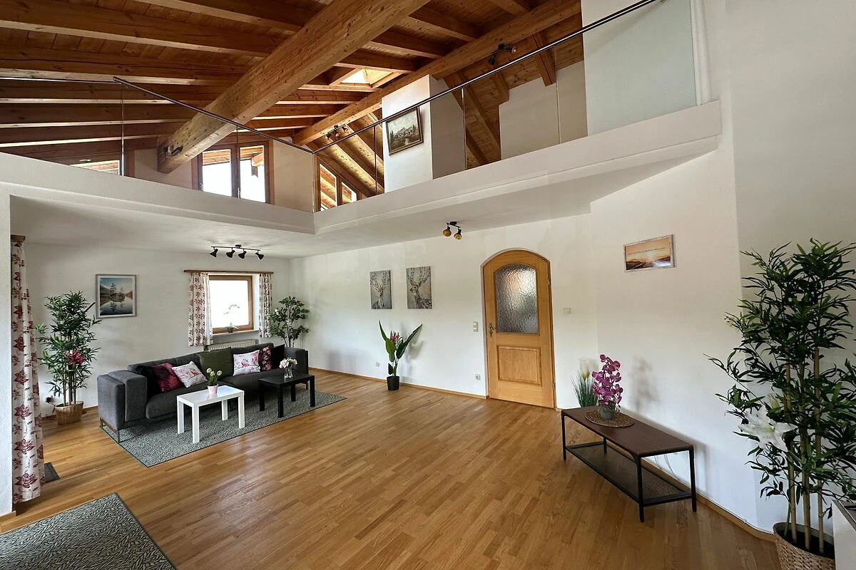 Die sehr grosszügige, sonnige und lichtdurchflutete Ferienwohnung befindet sich im I. OG mit gemütlichen Erker und Sicht auf die Bergwelt und teils Seeblick. Ein separater, grosszügiger Rückszugsbereich befindet sich in der modernen, offenen Galerié im DG, die einen eigenen Eingang und eine eigene Einheit zum erholsamen Rückzug (Lesen, Relax, sonnig und Ausblick etc.) in heimeliger Umgebung bietet.
