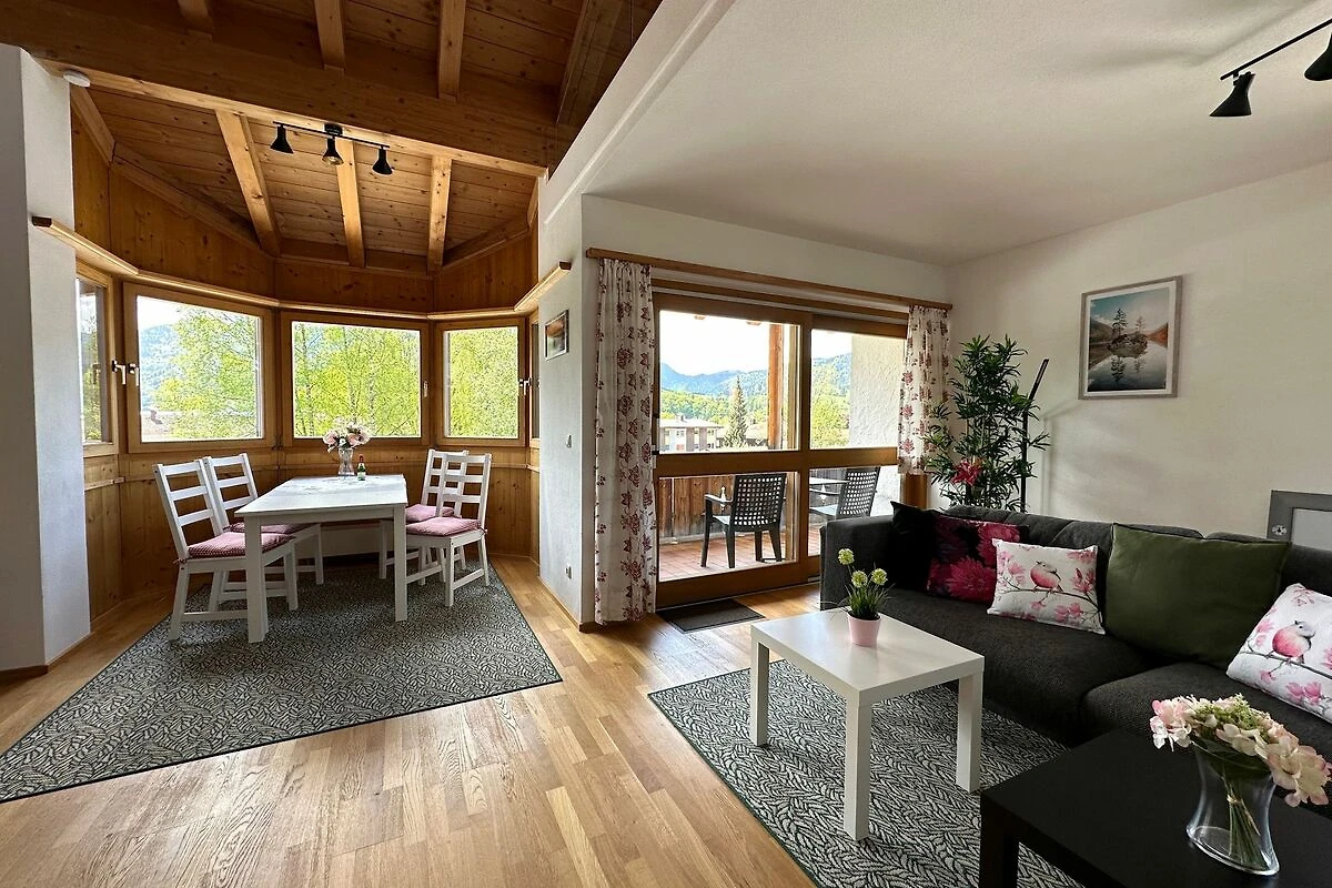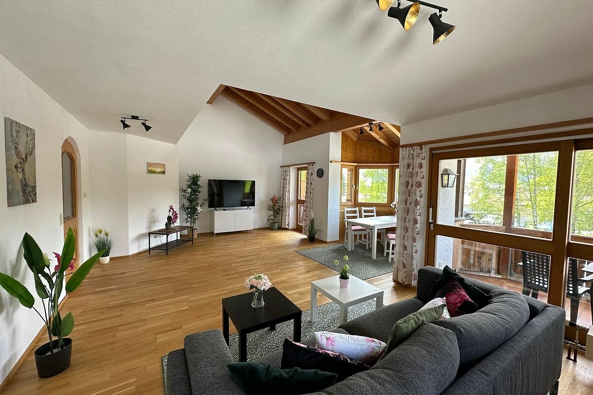 Das grosszügige, helle Wohnzimmer bietet aus jedem Winkel eine attraktive Aussicht auf die Berge und Natur, eine vollwertige Küche, Diele, modernes Schlafzimmer mit Boxspringbett, neues modernes Badezimmer mit Badewanne, Dusche und WC garantiert Ihnen erholsames Ferienwohnen mit dem Wohnen wie Zuhause-Gefühl.