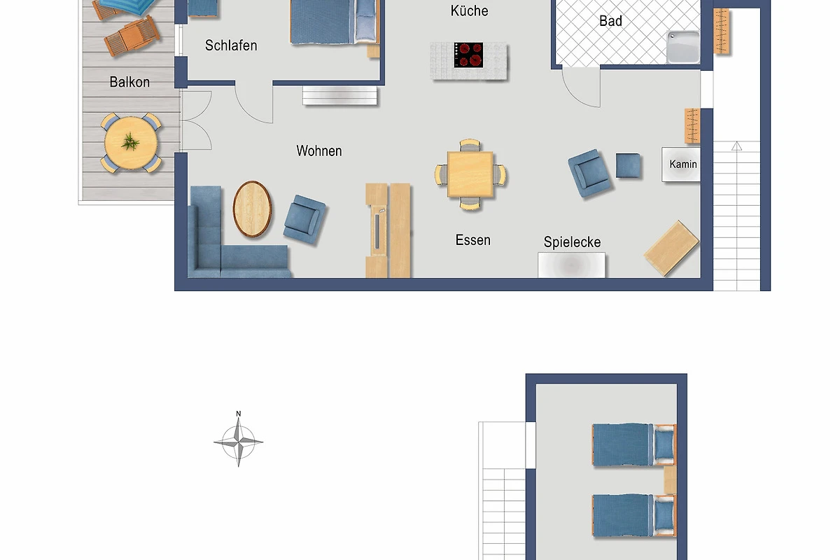 Im Küchenwohnraum gibt es eine Schlafcouch für zwei Personen. Im separaten Schlafzimmer ein Doppelbett, zusätzlich ein Kinderbett und einen Abenteuer-Hängeboden mit zwei Schlafplätzen.