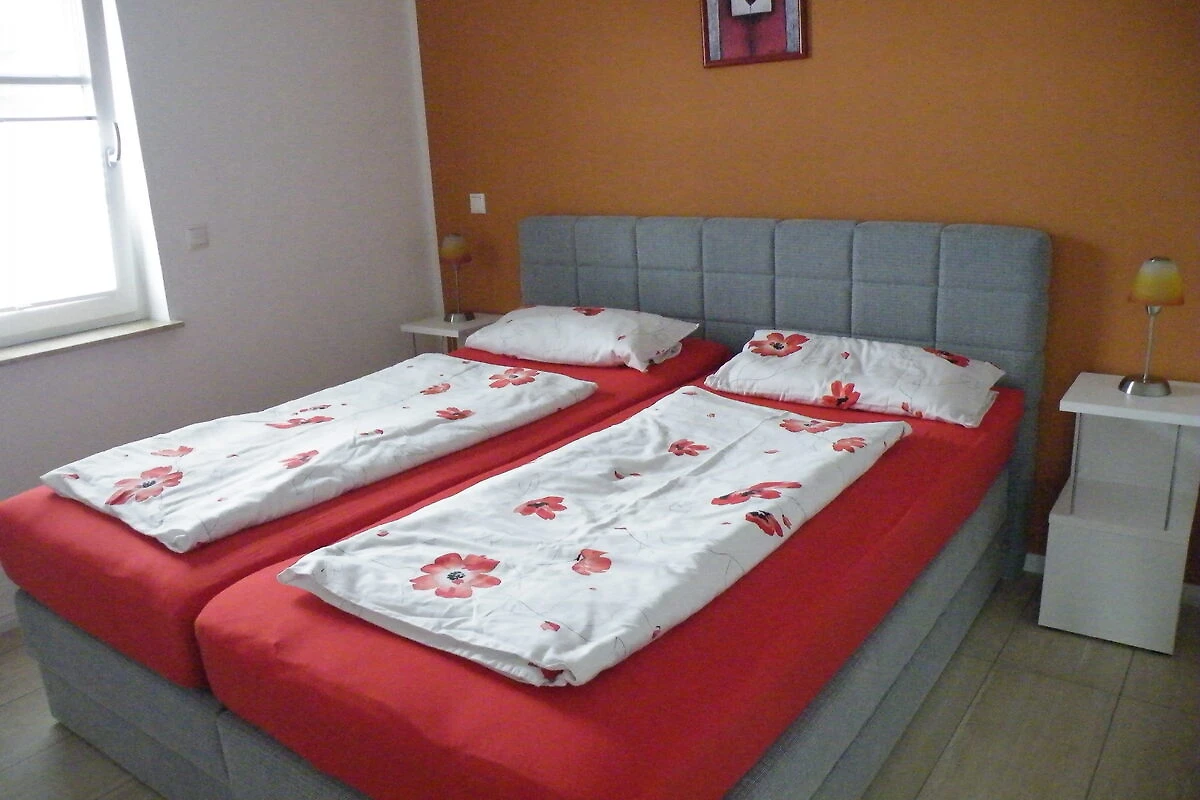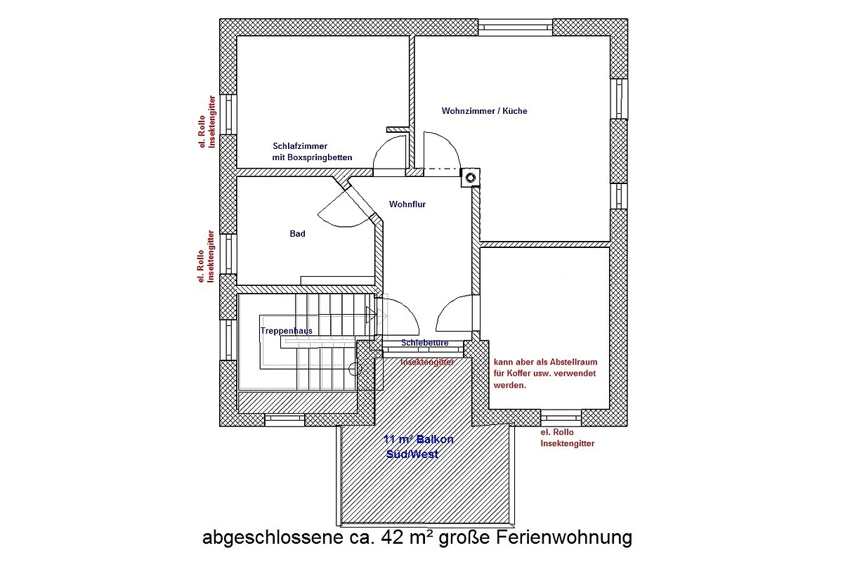 Die ca. 50 m² große abgeschlossene Ferienwohnung, im Obergeschoß eines Einfamilienhauses, mit großem ca. 12 m² teilüberdachtem Westbalkon besteht aus: