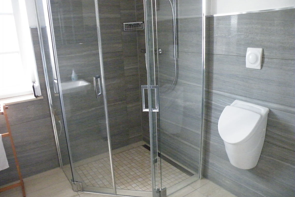Bad mit bodentiefe Dusche, WC, Bidet, Urinal, Spiegelschrank.