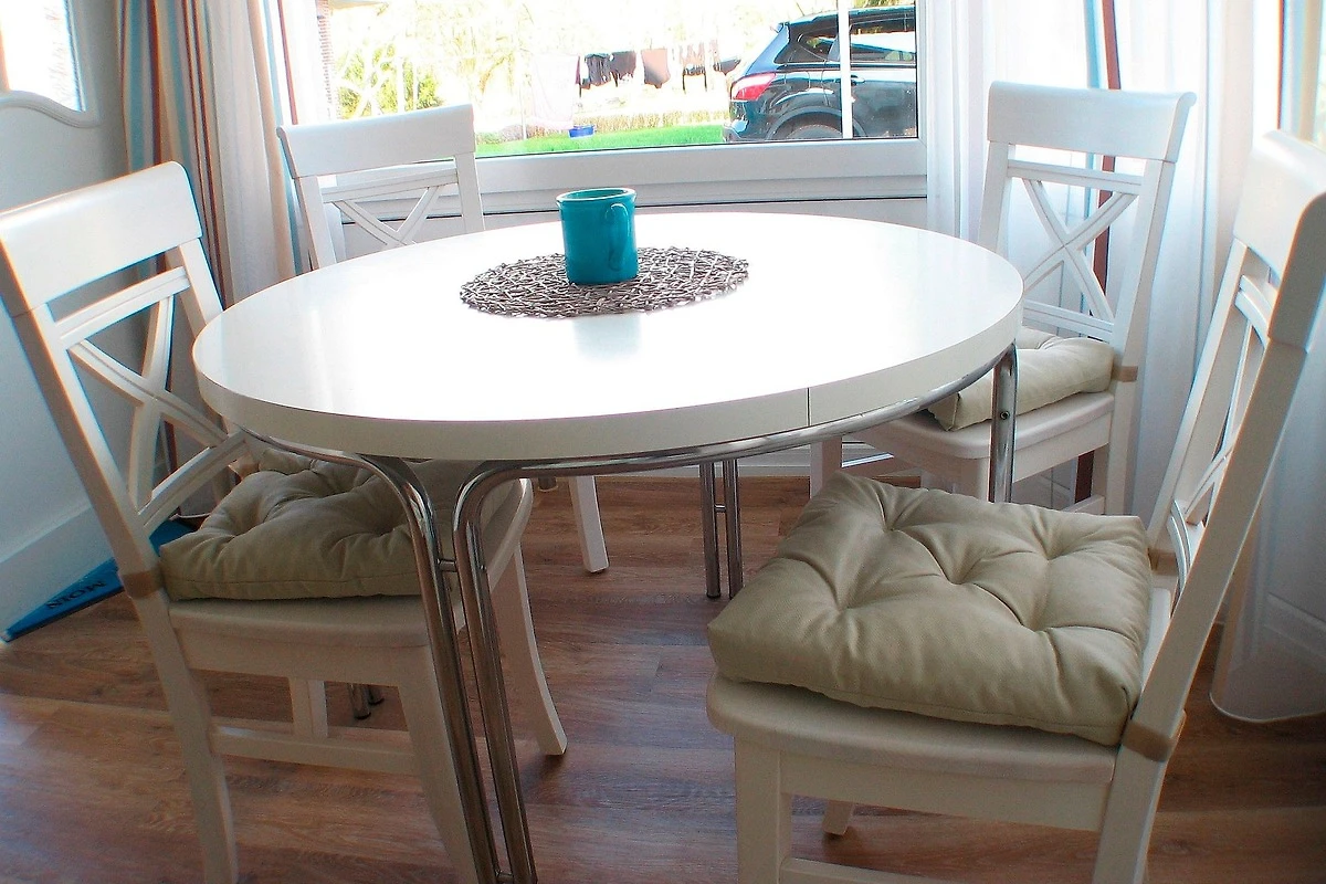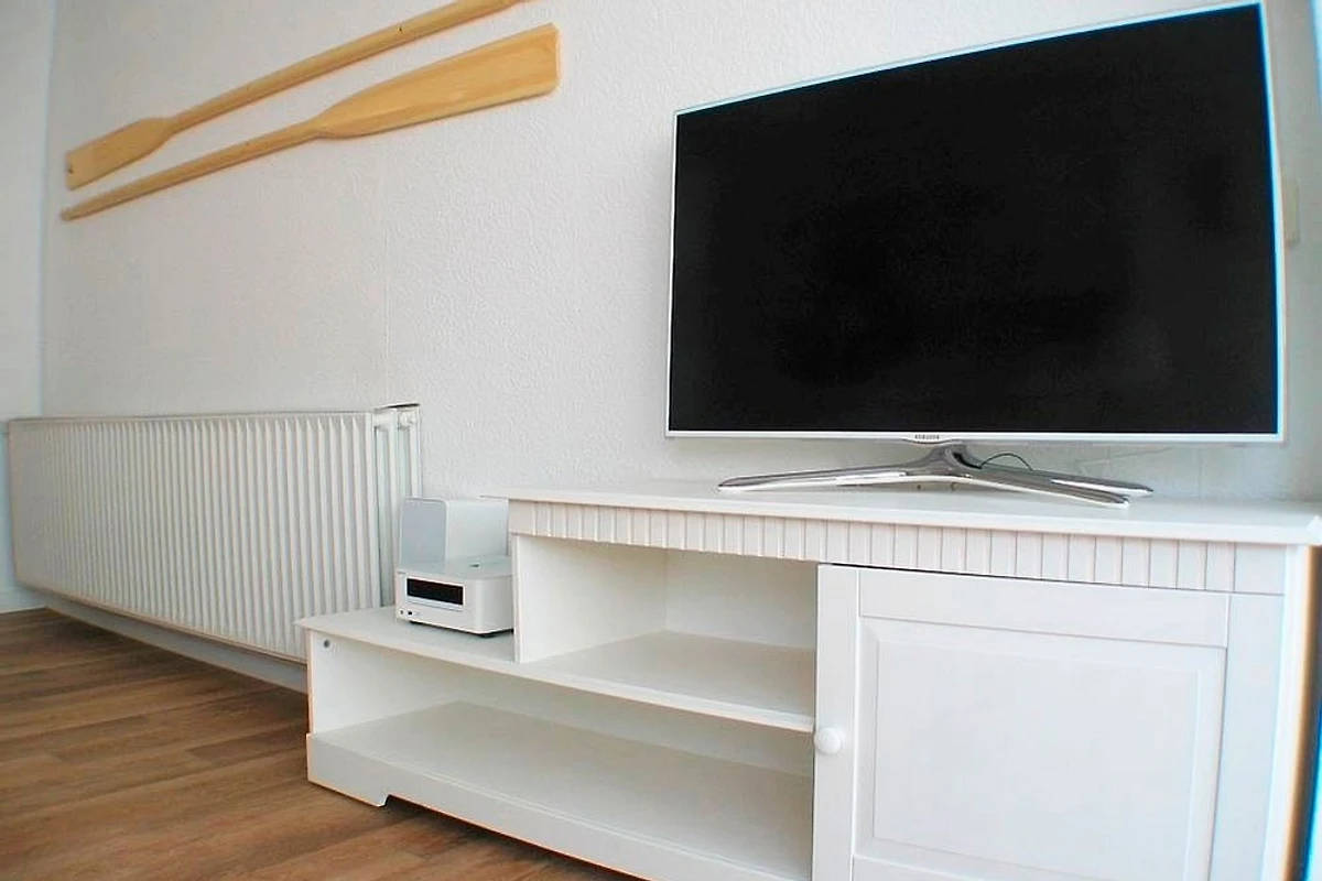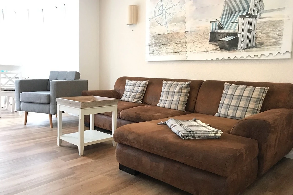 Der Wohnraum mit integrierter Küchenzeile und Essecke ist ein Ort für Gemütlichkeit und gesellige Stunden. Geniessen Sie in dem lichtdurchfluteten Erker den Blick in den Garten und den angrenzenden Kurpark vom Frühstückstisch aus. Die maritim gestaltete Sitzecke mit Eckcouch, Sessel und 40'' (102 cm) Flachbildschirm lädt zum Faulenzen ein, während in der Küche, die durch einen Tresen vom Wohnraum getrennt ist, das Abendessen zubereitet wird. NEU ! Eine nagelneue Einbauküche mit Geschirrspüler etc. - gleicher Preis :)