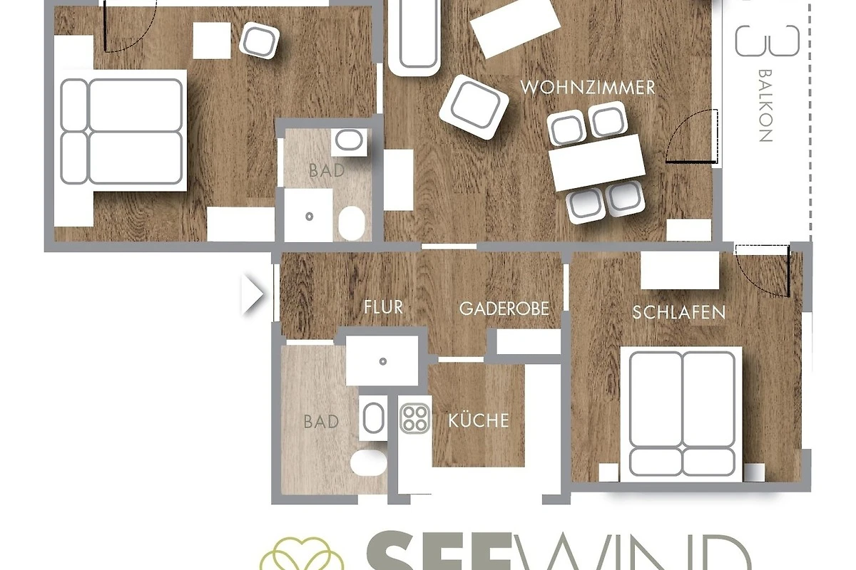 Unsere Wohnung "Seewind" ist eine 3-Zimmer Wohnung mit etwa 80 m², für eine 4-köpfige Familie bestens geeignet und liegt im Hochparterre des Hauses.
