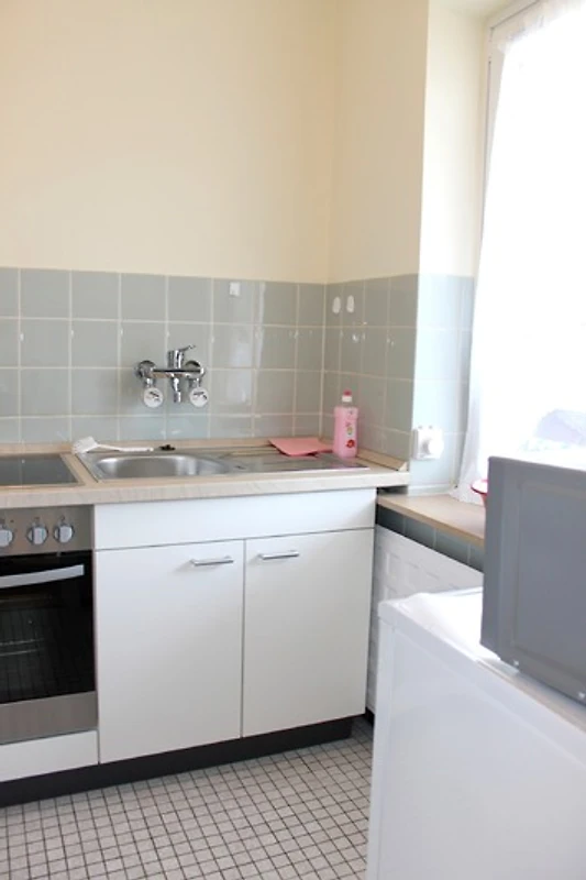 Die Küche bietet einen Backofen, einen 4-Plattenherd, eine Mikrowelle, eine Kaffeemaschine und andere Küchengeräte. Das Badezimmer verfügt über eine Dusche, ein WC, eine Waschmaschine und ein Fenster.