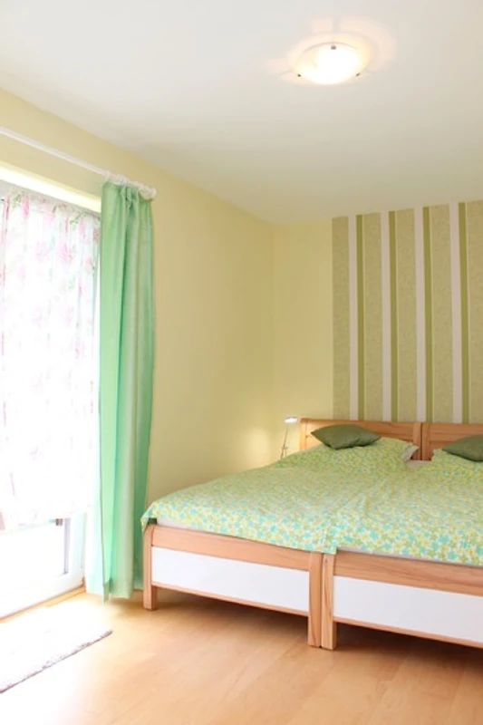 Das Wohn- / Esszimmer ist mit einer Schlafcouch (1,90 x 2 m) und einem Essplatz für 3 Personen ausgestattet, mit Zugang zum möblierten Balkon. Im separaten Schlafzimmer befindet sich ein Doppelbett mit getrennten Matratzen (0,90 x 2,00 m) und ein grosser Kleiderschrank. Verdunklungsvorhänge sind vorhanden.