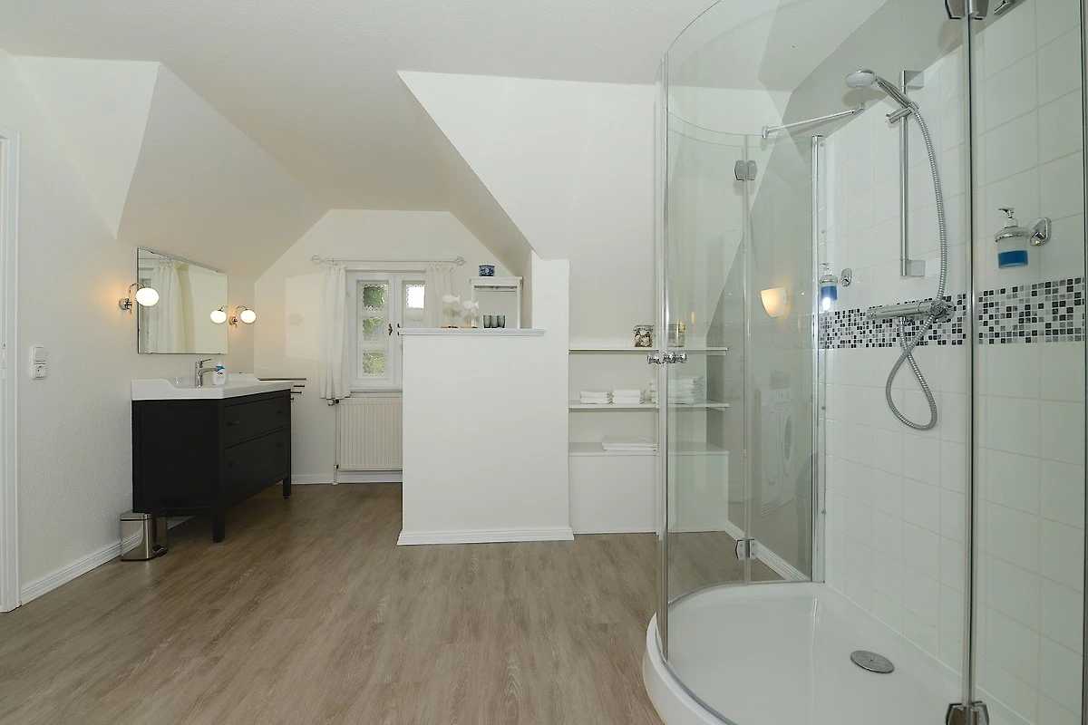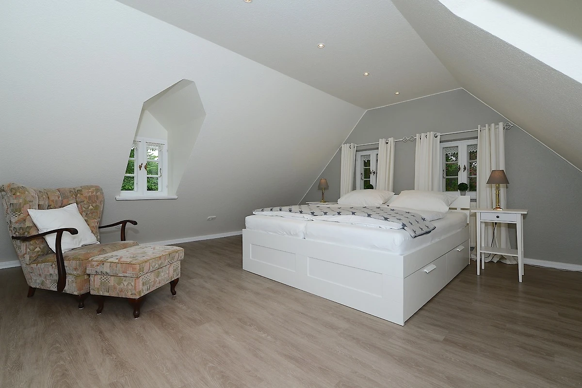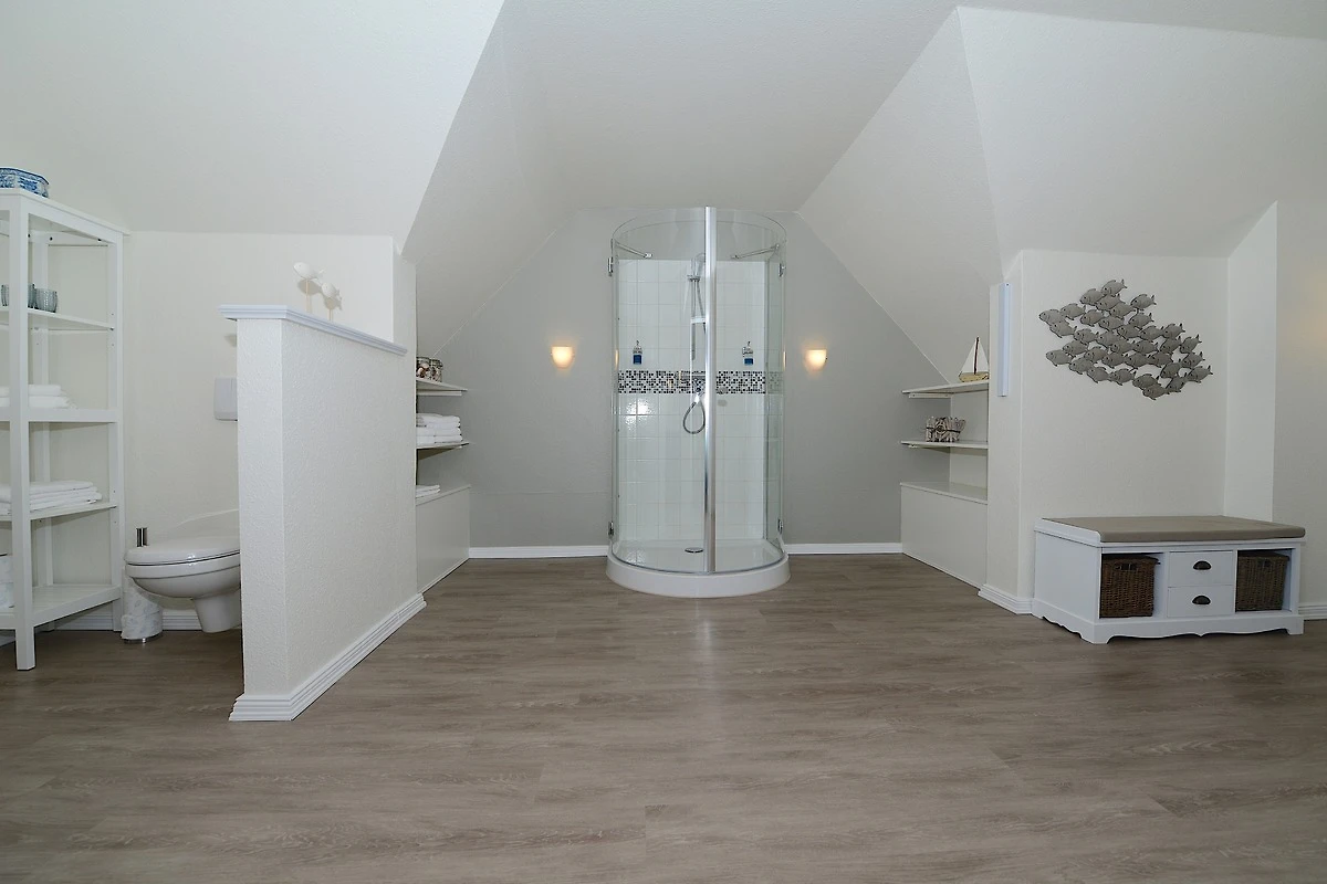 Im Obergeschoss erwartet Sie ein stilvolles Schlafzimmer mit exklusivem Designboden und ein grosszügiges Badezimmer. Das Schlafzimmer ist mit einem hochwertigen Doppelbett ausgestattet, das für erholsamen Schlaf sorgt. Ein gemütlicher Ohrensessel lädt zum Entspannen ein. Das Badezimmer bietet Platz für Wellness-Momente mit einer grosszügigen Runddusche und einem grossen Waschtisch-WC-Bereich. Ein Fön, Waschmaschine und Trockner stehen Ihnen ebenfalls zur Verfügung.