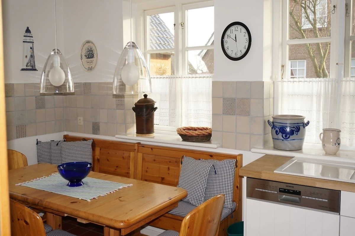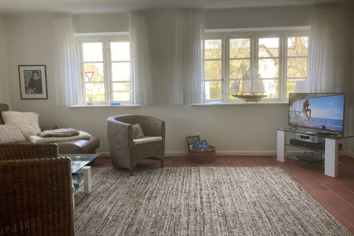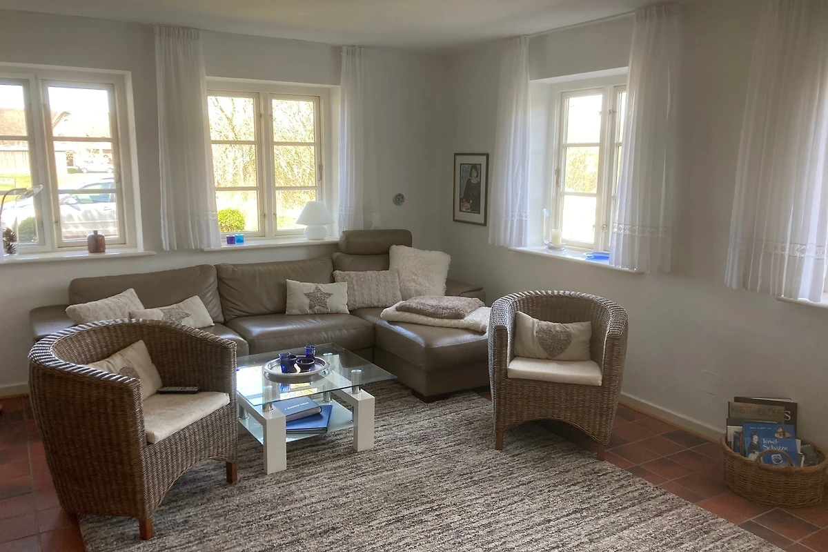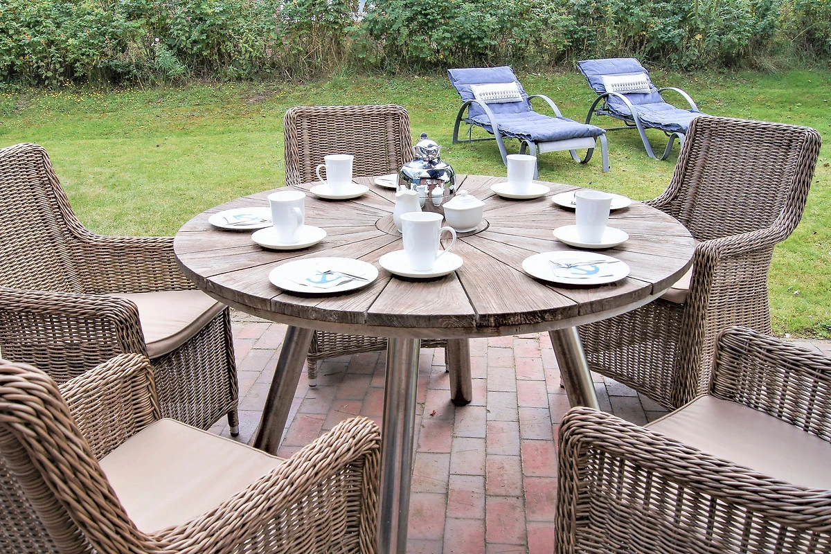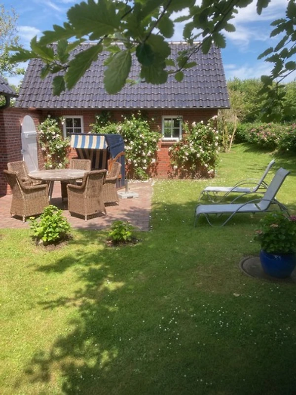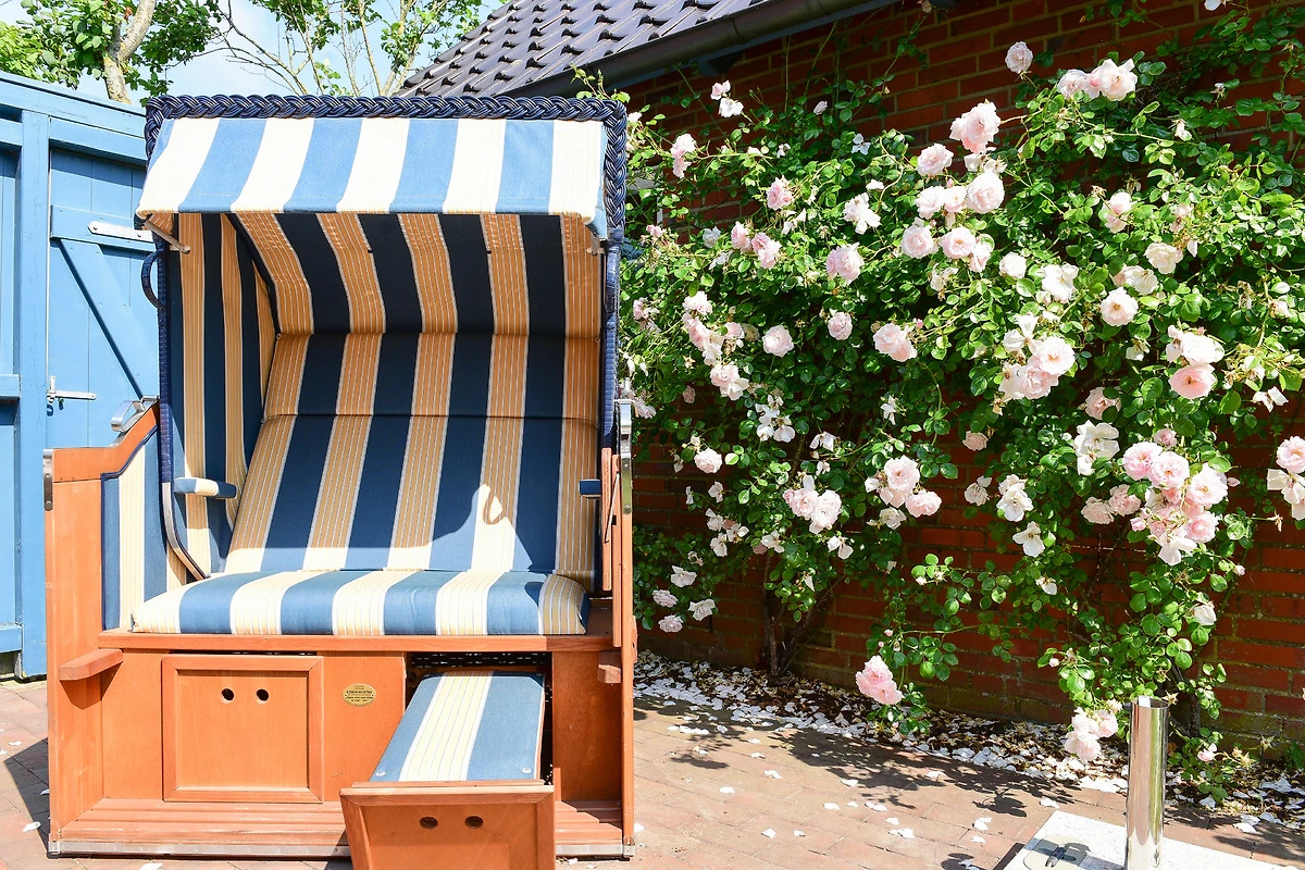 Der lichtdurchflutete Wohnbereich im Erdgeschoss bietet eine gemütliche Sitzgarnitur und einen Flachbildschirm-TV für entspannte Abende. Der Kamin sorgt an kühlen Tagen für behagliche Wärme. Die offene, voll ausgestattete Küche mit grossem Esstisch lädt zum gemeinsamen Kochen und Verweilen ein. Vom Wohnbereich gelangen Sie direkt in den Garten, wo Sie im Strandkorb (während der Sommersaison) oder auf der Terrasse entspannen können.