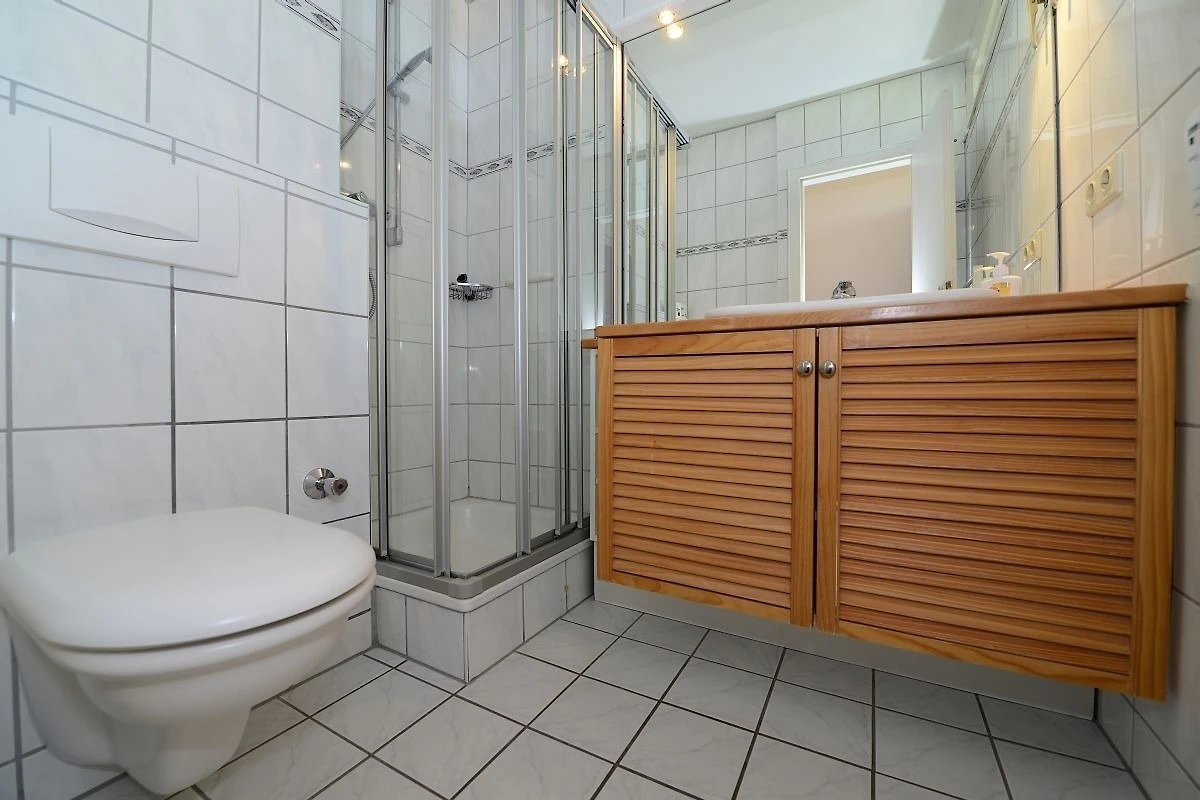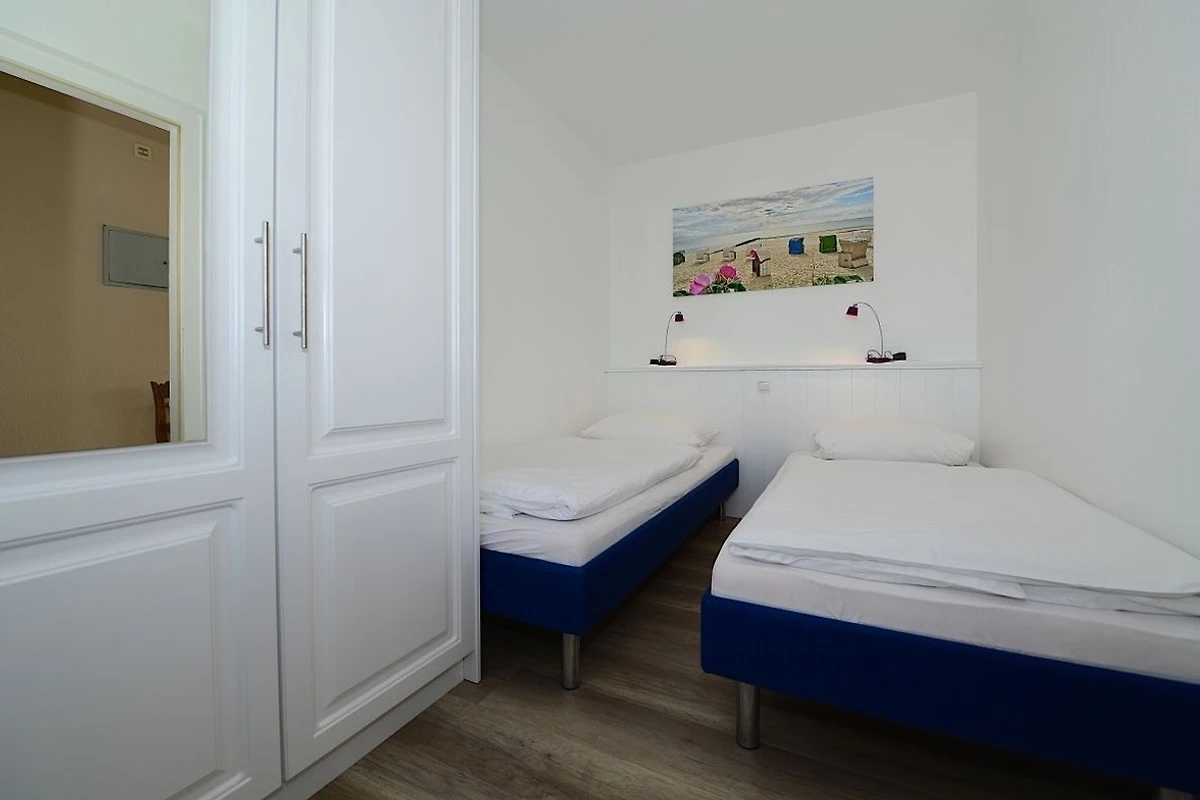 Im separaten Schlafzimmer mit Doppelbett können Sie sich nach einem ereignisreichen Tag erholen. Der Kleiderschrank bietet ausreichend Stauraum für Ihr Gepäck, und vom Fenster aus haben Sie einen tollen Blick auf die Stadt Wyk und die historische Wyker Mühle. Das helle Bad ist mit einer Dusche und einem praktischen Waschtisch ausgestattet.