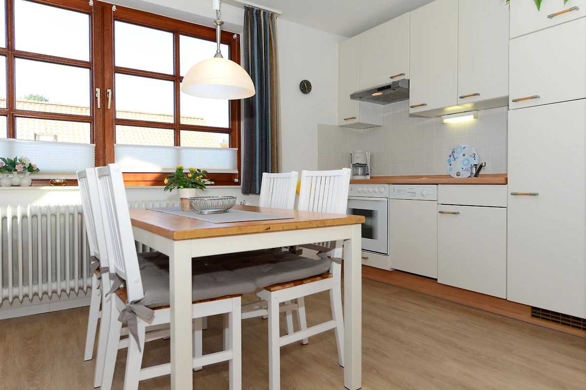 Der Essplatz und die gut ausgestattete Küchenzeile fügen sich harmonisch in den Raum und laden Sie zu gemeinsame Mahlzeiten ein.