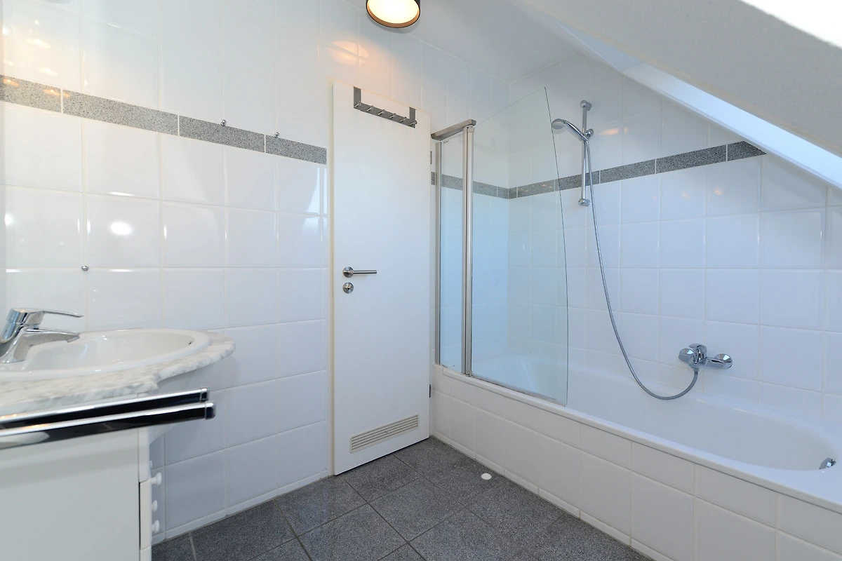 Das weiss geflieste Badezimmer mit Badewanne bietet genügend Platz für Ihre Pflegeprodukte und lädt nach einem Strandtag zum entspannen ein.