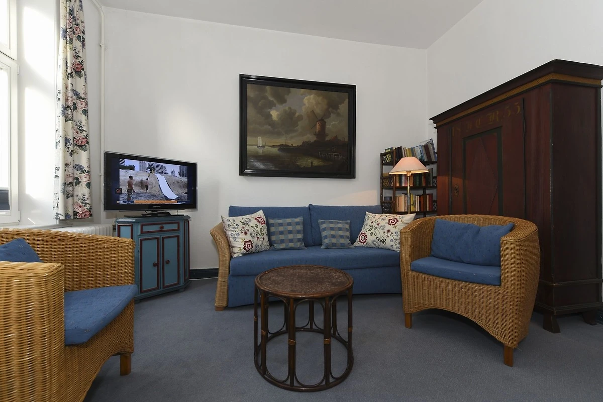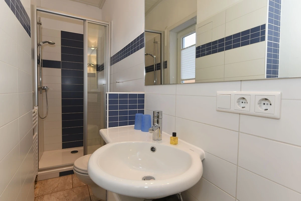 Im ersten Obergeschoss erwartet Sie diese Wohnung im klassischen Friesenblau.