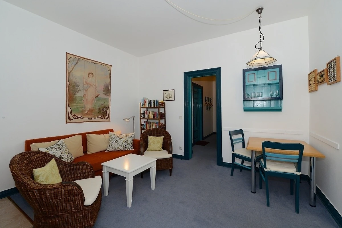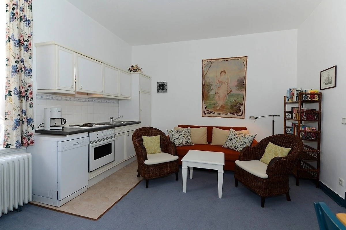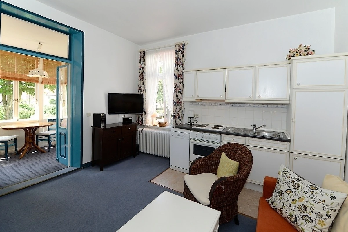 Das Sofa und die Korbsessel laden zum Entspannen ein, und der Flachbildfernseher sorgt für Unterhaltung. Vom Wohnbereich gelangen Sie auf die lichtdurchflutete Loggia mit Blick auf den Mühlenpark.
