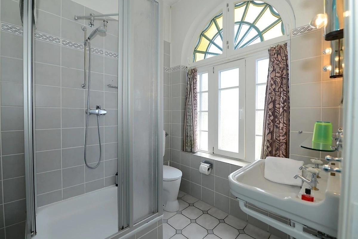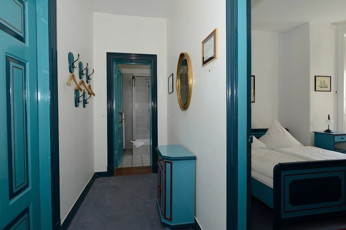 Das Schlafzimmer im klassischen Friesenblau bietet ein komfortables Doppelbett, und das nostalgische Bad mit Duschkabine verleiht der Wohnung einen ganz besonderen Charme.