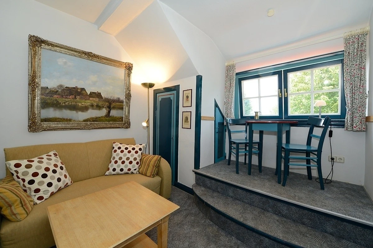 Besonders charmant ist der kleine Bereich auf einer Empore, der mit Blick auf den Mühlenpark ein idealer Ort für zwei Personen ist.