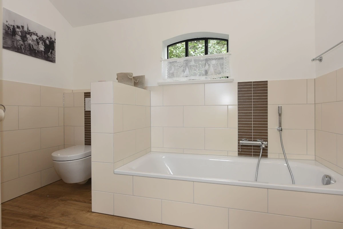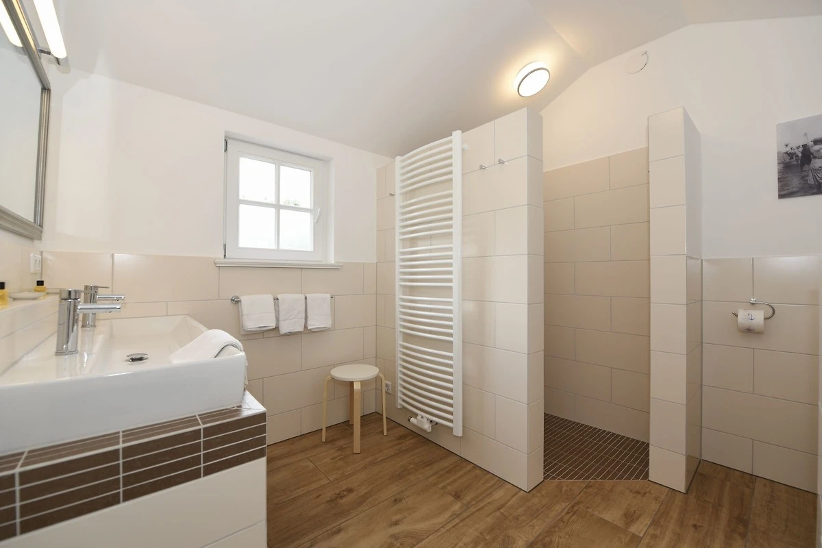 Ein weiteres Highlight des Erdgeschosses ist das stilvolle Dusch-Wannenbad im hinteren Hausteil, das mit besonderen Details wie antiken gusseisernen Stallfenstern begeistert. Diese liebevollen Akzente finden sich im gesamten Haus und machen den Aufenthalt zu etwas ganz Besonderem.