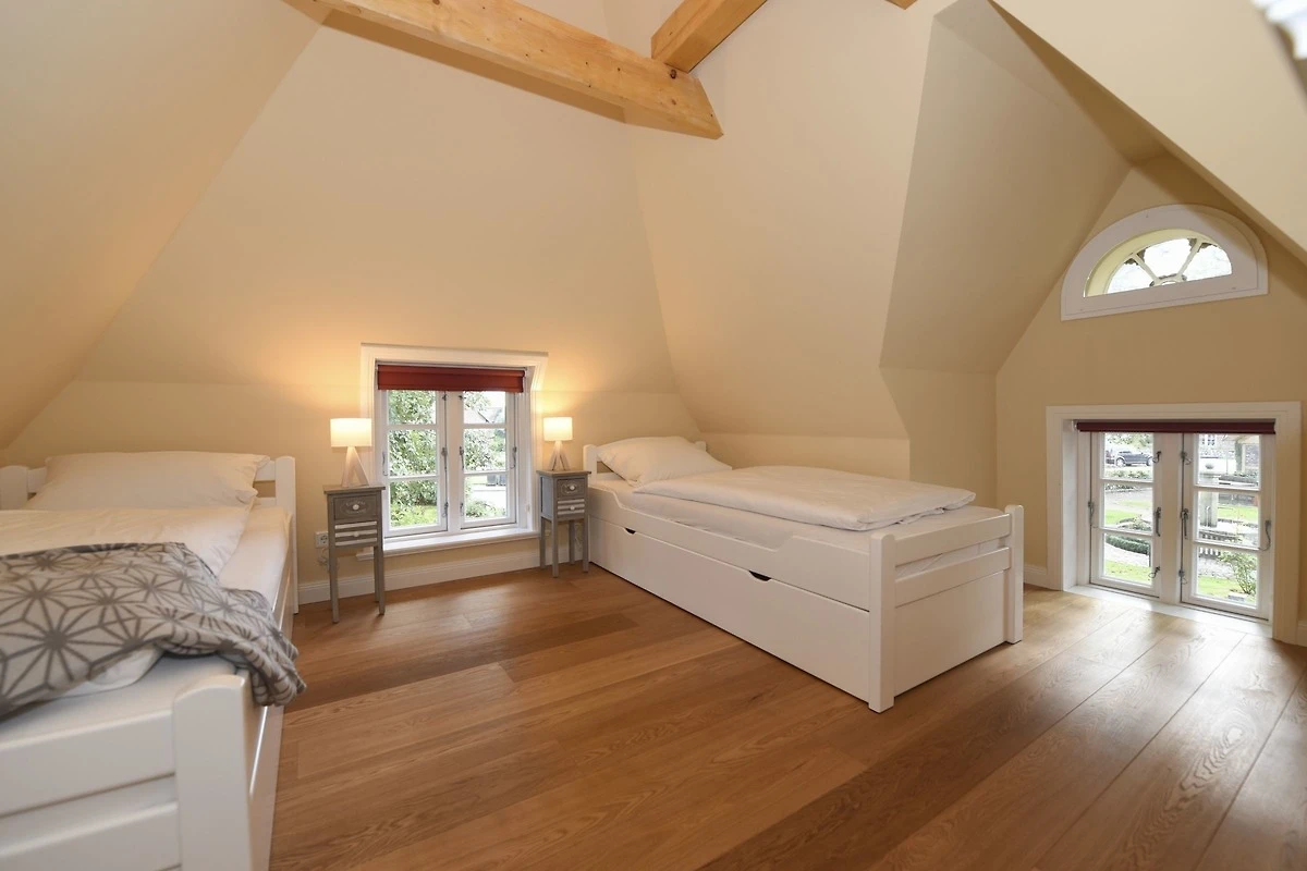 Im Obergeschoss erwarten Sie zwei geschmackvoll eingerichtete Schlafzimmer mit bodentiefen Holzflügelfenstern, die für viel Tageslicht und eine gemütliche Atmosphäre sorgen.