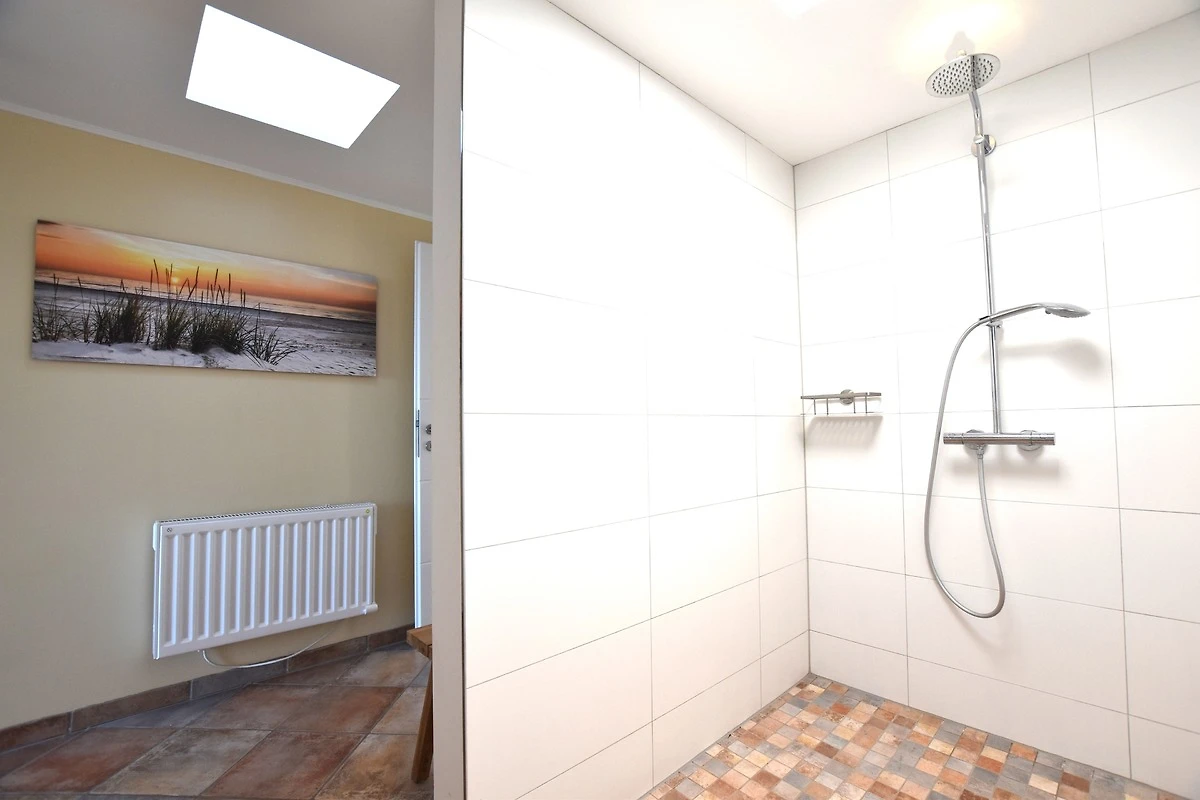 Badezimmer: bodentiefe Dusche, Handtücher, Spiegel, Waschtisch, WC, Fussbodenheizung