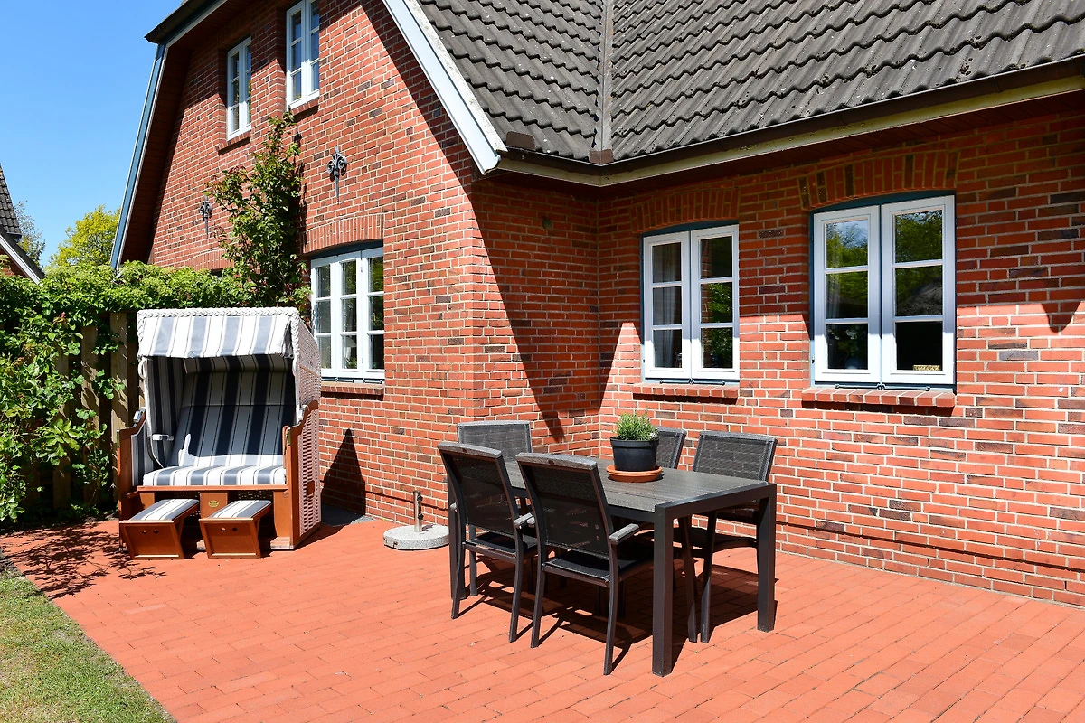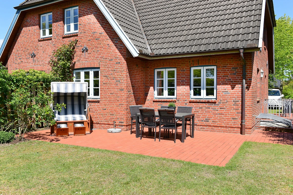 Der grosse Garten sowie die sonnige Terrasse mit Strandkorb und Gartenmöbeln sind ideal, um die frische Nordseeluft zu geniessen.