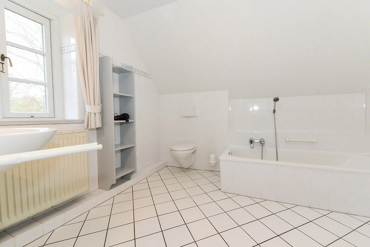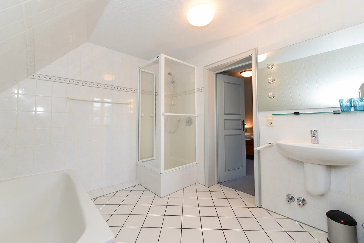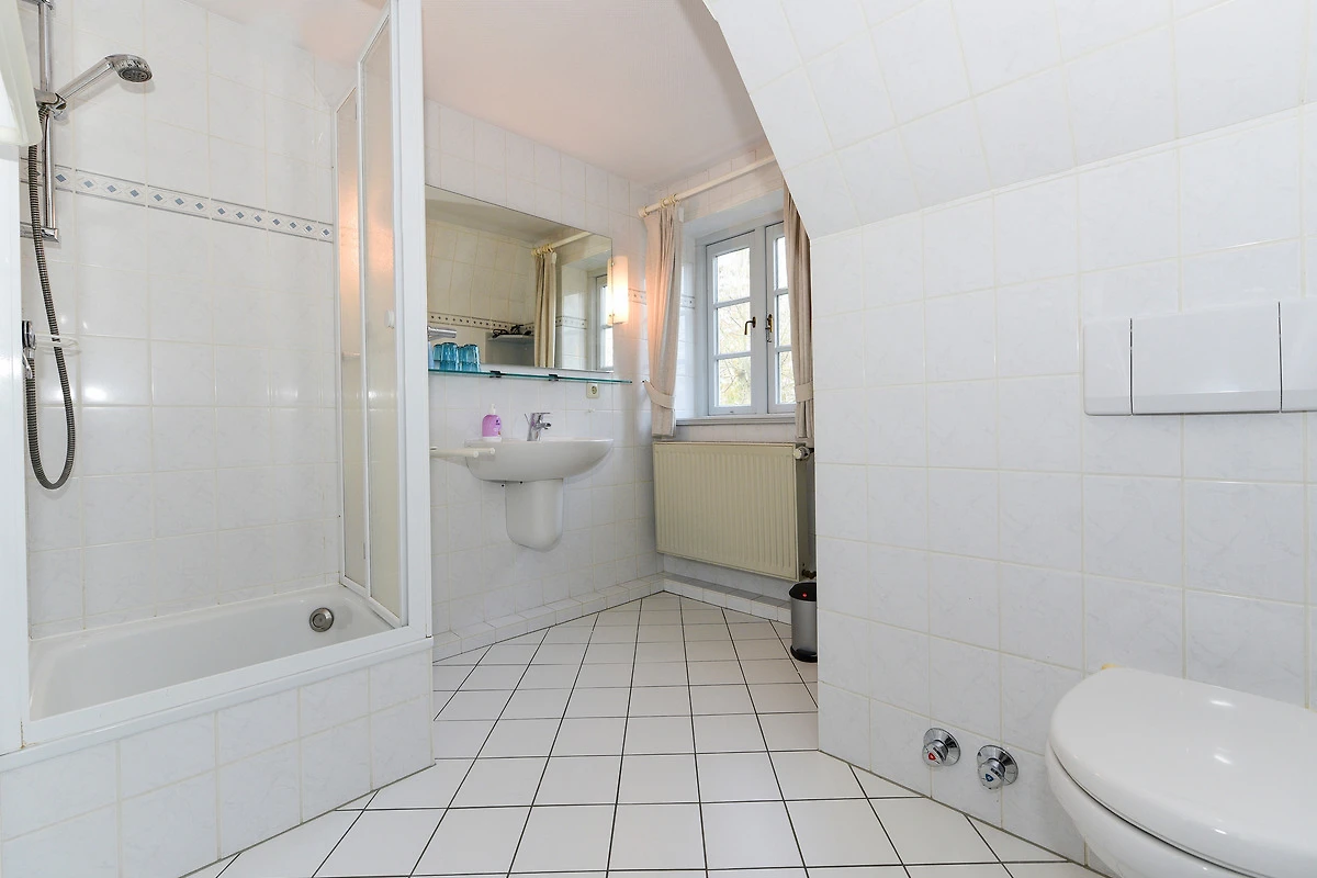 Im Obergeschoss finden Sie ein grosses Vollbad mit Wanne, Dusche und WC sowie ein zusätzliches Duschbad.