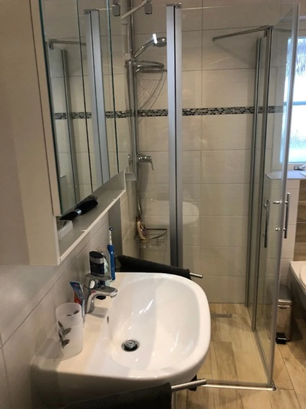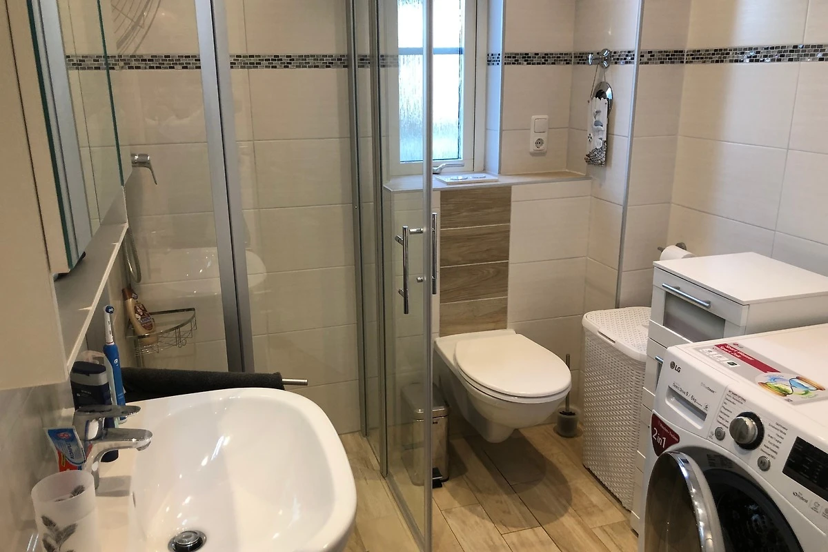 Modernes, freundliches Tageslichtbad mit Dusche, WC, Waschbecken, Haartrockner. Natürlich bieten wir Ihnen auch einen Waschtrockner zur Benutzung an.