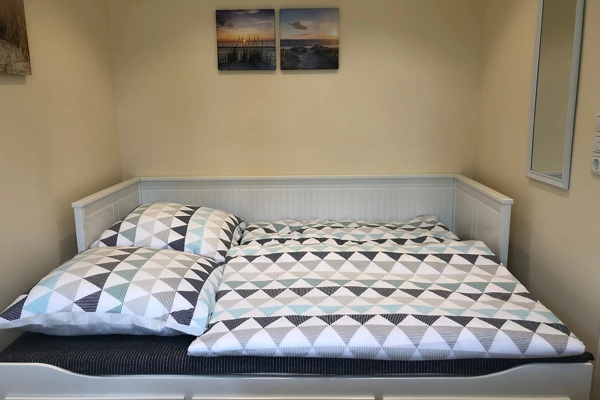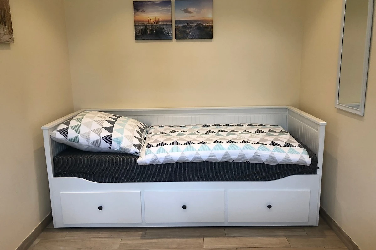 Separates, modern eingerichtetes Schlafzimmer mit einem Tagesbett. Neben der Nutzung als Sofa kann das Bett mit wenigen Handgriffen in eine Liegefläche (80x200cm) umgebaut werden.
