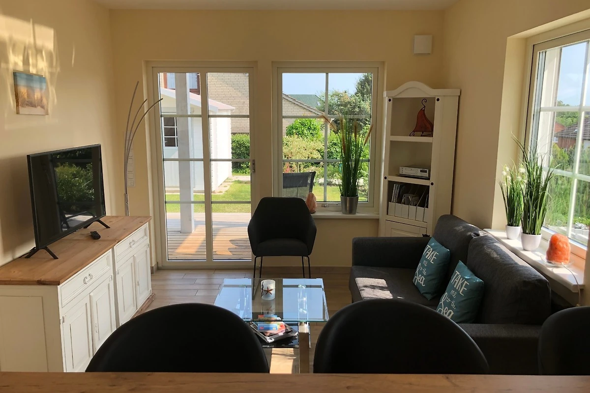 Modernes, helles, geschmackvoll eingerichtetes Wohnzimmer mit Terrassenzugang. Für einen gemütlichen Abend steht Ihnen ein 43 Zoll Fernseher zur Verfügung.