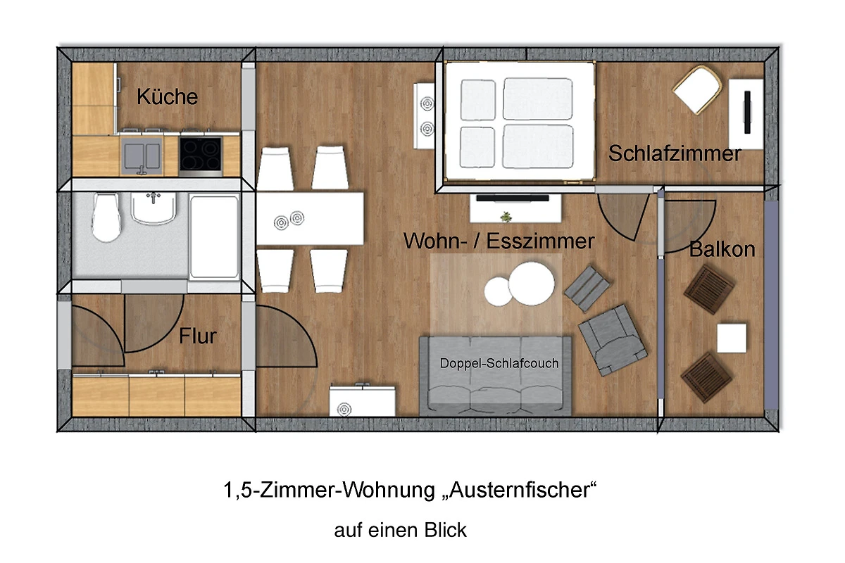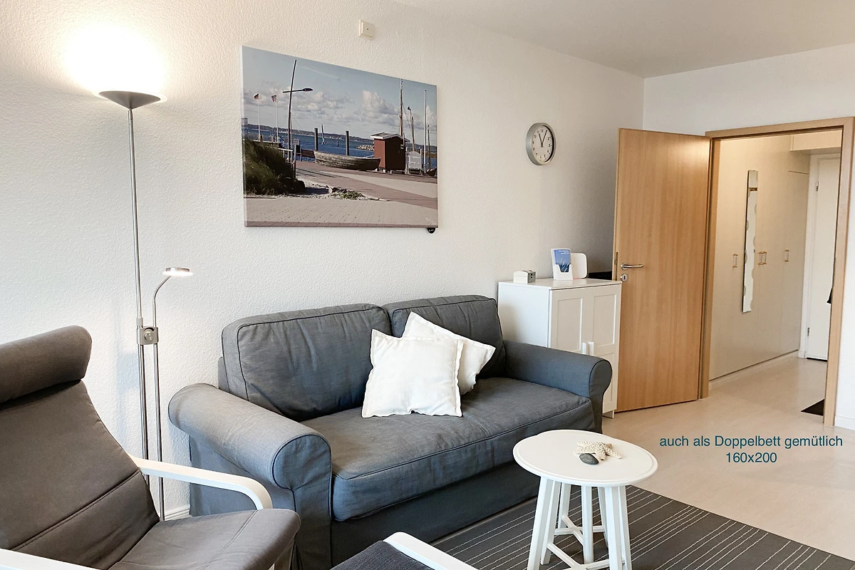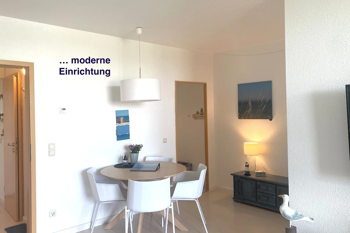 Diese gepflegte 1,5-Zimmer-Nichtraucher-Wohnung in einem ruhigen Apartmenthaus ist mit dem Aufzug oder über die Treppe zu erreichen und bietet nicht zuletzt mit dem Süd-West-Balkon alles, was Sie für Ihren Wohlfühl-Urlaub am Meer brauchen: Im Wohn-/Schlafzimmer steht ein Kuschelsofa, dass kinderleicht zu einem bequemen Doppelbett wird. Im Schlafzimmer finden Sie ein Doppelbett für kuschelige Nächte und den zweiten Fernseher. Die Wohnung verfügt über Kabel-(Smart-)TV inkl. Netflix und Prime mit Ihrem privaten Zugang, Radio/CD, diverse Bücher und Spiele, einen gemütlichen Essplatz und ein modernes Duschbad mit extra grosser Duschkabine (70x120). Die separate Einbauküche ist ausgestattet mit reichlich Geschirr, Ceranfeld, Mikrowelle, Geschirrspüler, Kühlschrank/Gefrierfach, Kaffeemaschine, Wasserkocher und Toaster. Im Flur ist ein grosser Einbauschrank mit viel Platz für Ihre persönlichen Dinge. Der seitliche Meerblick von Ihrem Balkon lässt auch durch den regen Schiffsverkehr keine Langeweile aufkommen.