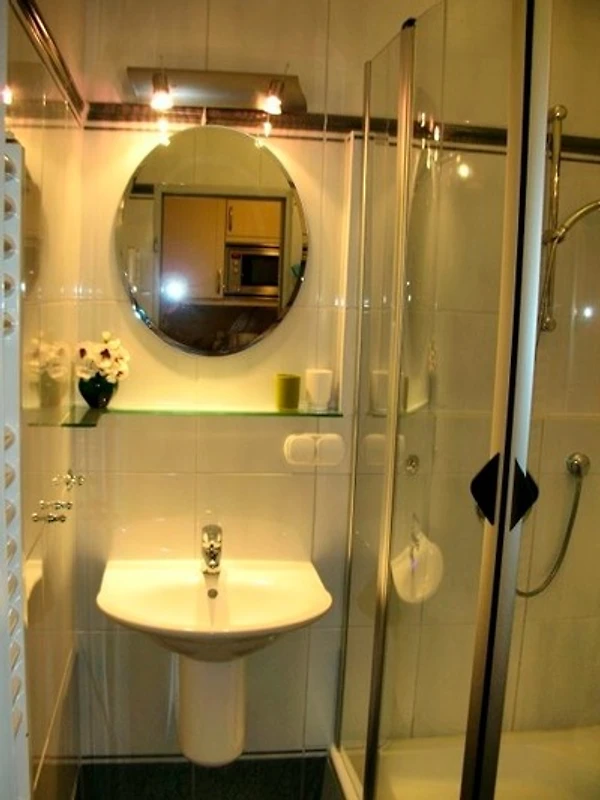 Küchenzeile im hellem Design mit Mikrowelle, Toaster, Eier- und Wasserkocher und Quirler. Zur Ausstattung des Badezimmers gehört eine Runddusche und selbstverständlich ein Handtuchtrockner und ein Fön.
