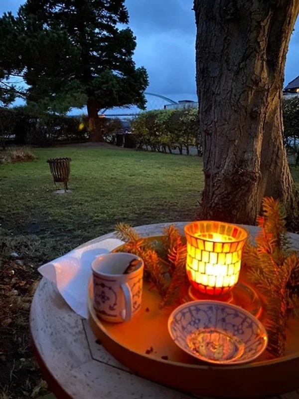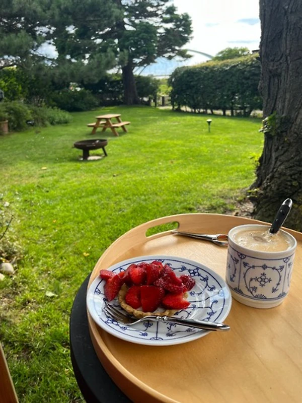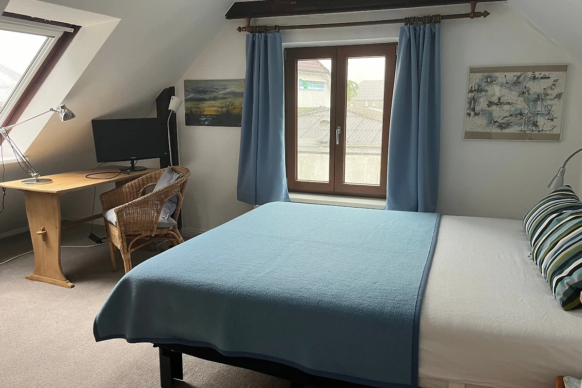 Das Obergeschoss verfügt über einen grossen Wohn-/Schlafraum mit herrlichem Blick auf den Sund und die Brücke und ist mit zwei Einzelbetten und separatem Sofa ausgestattet. Ausserdem gibt es ein weiteres Schlafzimmer mit Doppelbett (200 x 160) und Waschtisch
