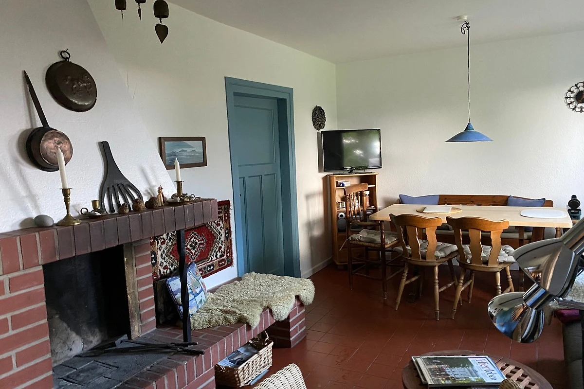 Im Erdgeschoss befindet sich ein Wohnzimmer mit Kamin, Sofa, Essplatz mit Blick auf die Fehmarnsund-Brücke, SatTV. Ausserdem gibt es eine voll ausgestattete Küche mit Geschirrspüler, ein Duschbad mit WC, sowie ein Schlafzimmer mit Doppelbett (200 x 180) und Waschbecken
