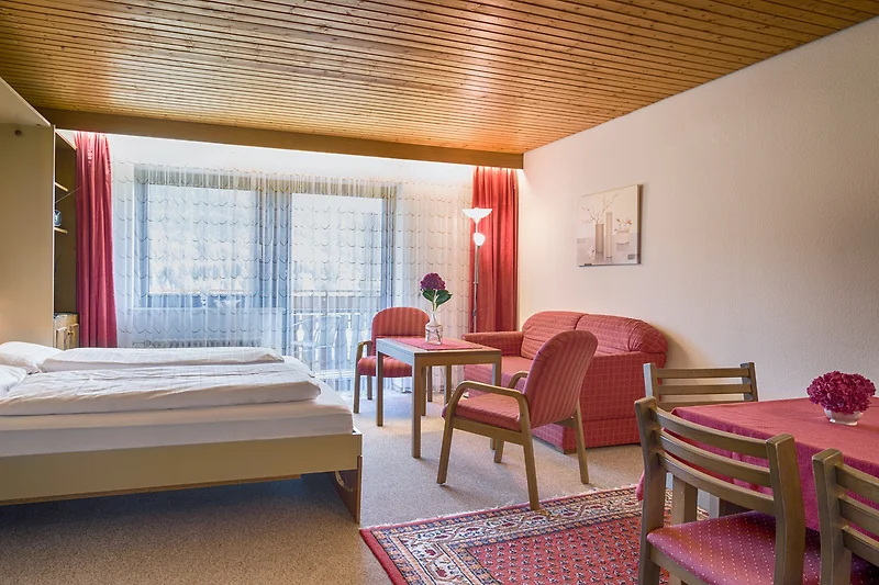 Wohn-/Schlafzimmer: Essecke, Sitzgruppe, Schlafcouch, 1 Schrank-Doppelbett, Bettwäsche, TV