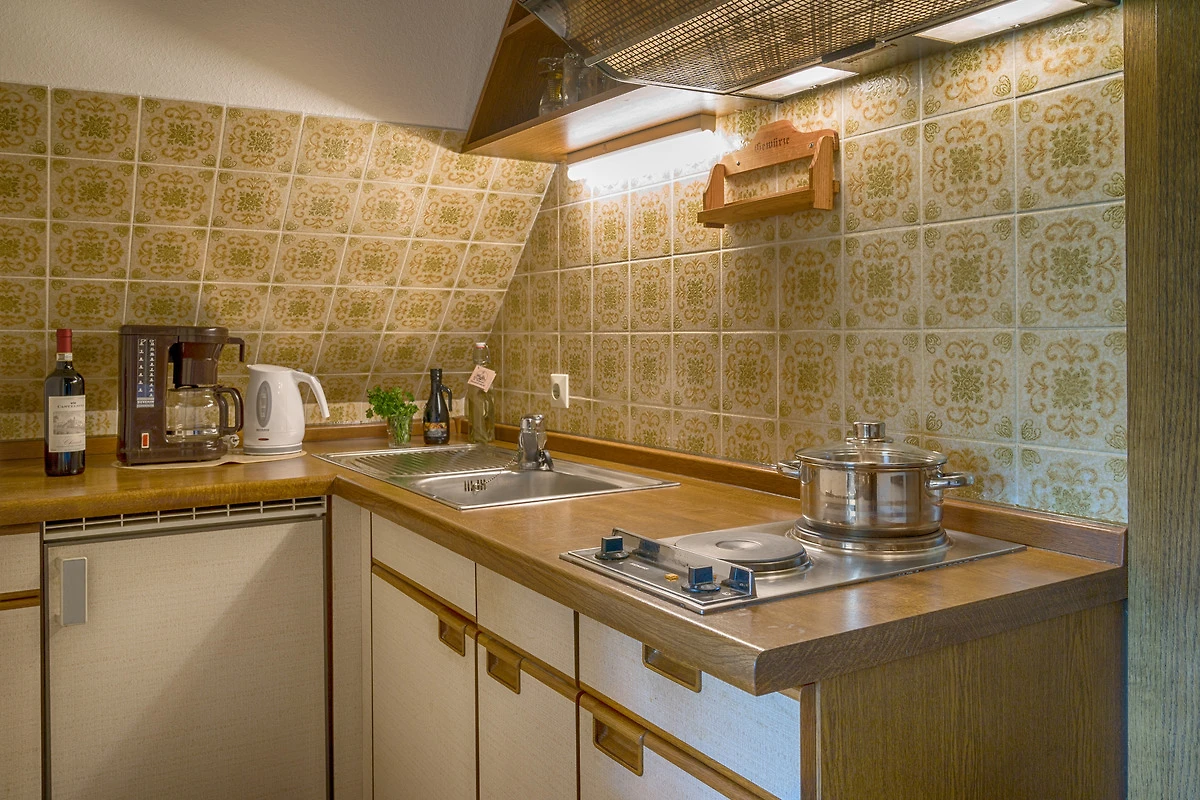 Balcony at the room, 1 double bed, seating, TV, kitchenette/cooking facilities, stove, refrigerator, coffee machine (Senseo-Pad), toaster, bed linen, towels, hair dryer
