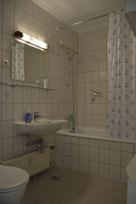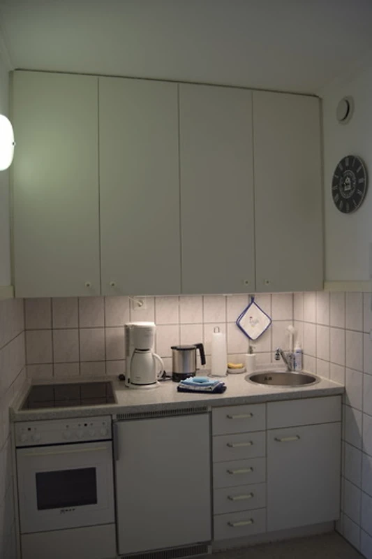 Die Küchenzeile verfügt über einen Herd und einen Backofen, einen Kühlschrank mit Gefrierfach sowie Kaffeemaschine und Wasserkocher. Ein Toaster, ein Eierkocher, ein Handmixer und eine Mikrowelle sind ebenfalls vorhanden. Im Badezimmer befindet sich eine Badewanne, ausreichend Stauraum sowie eine Tritt-Erhöhung für Kinder.
