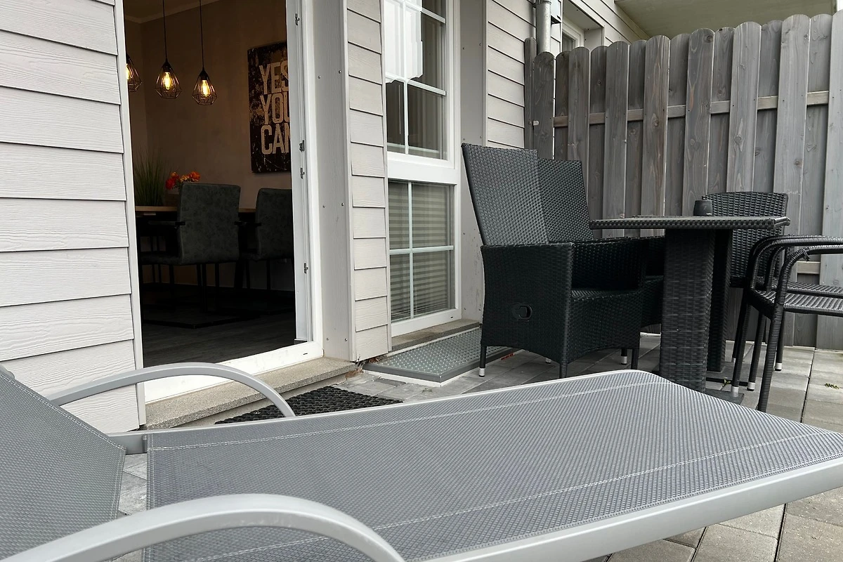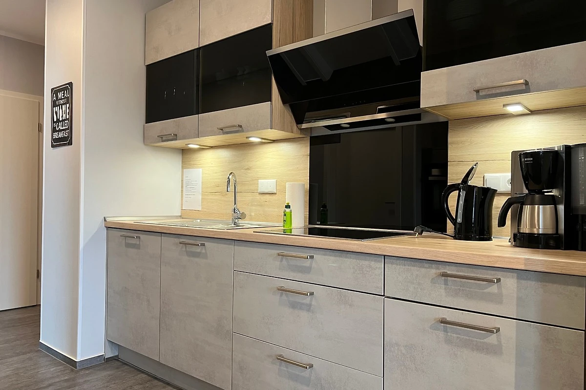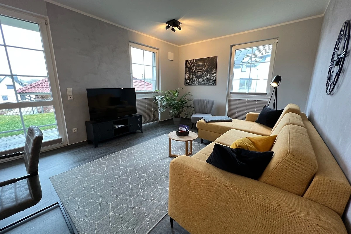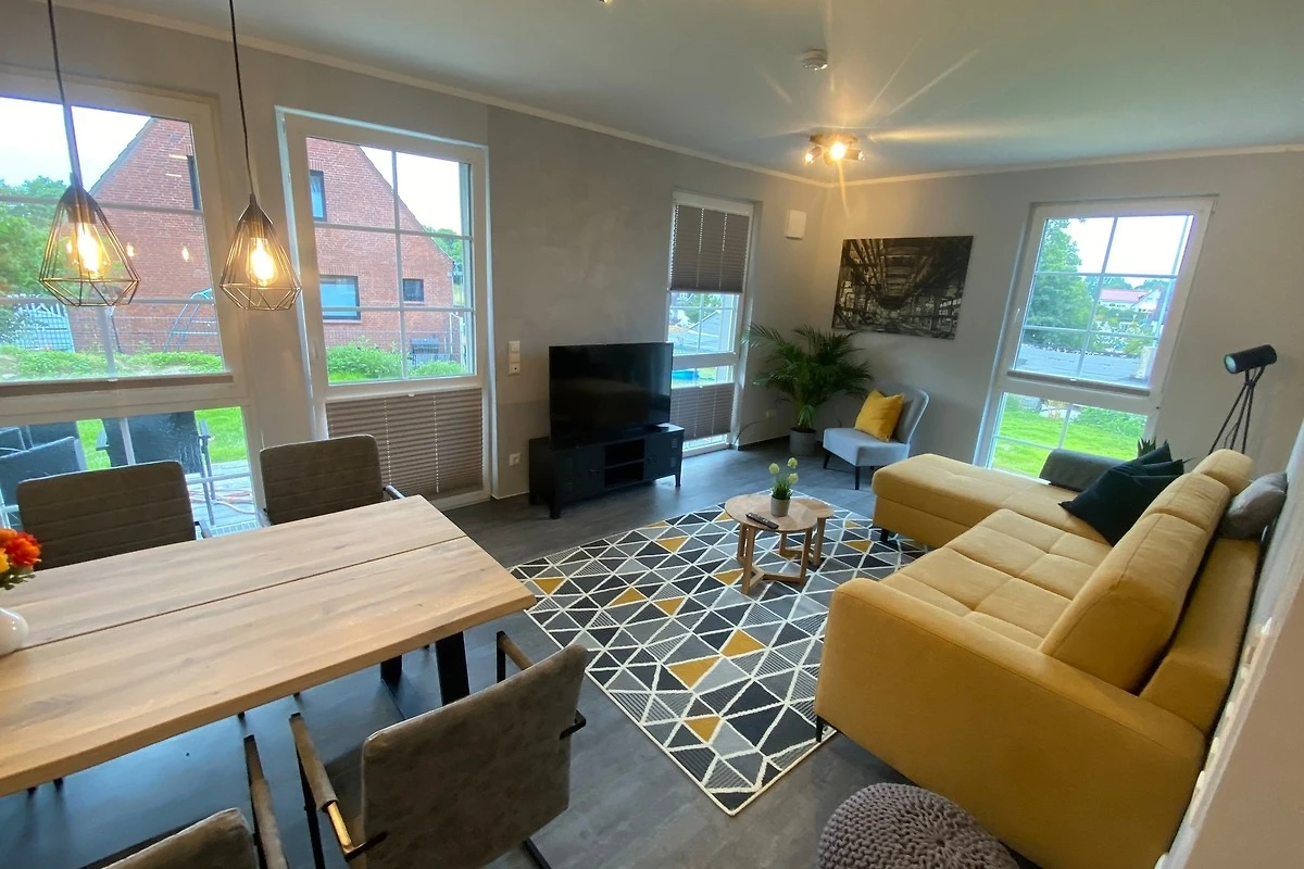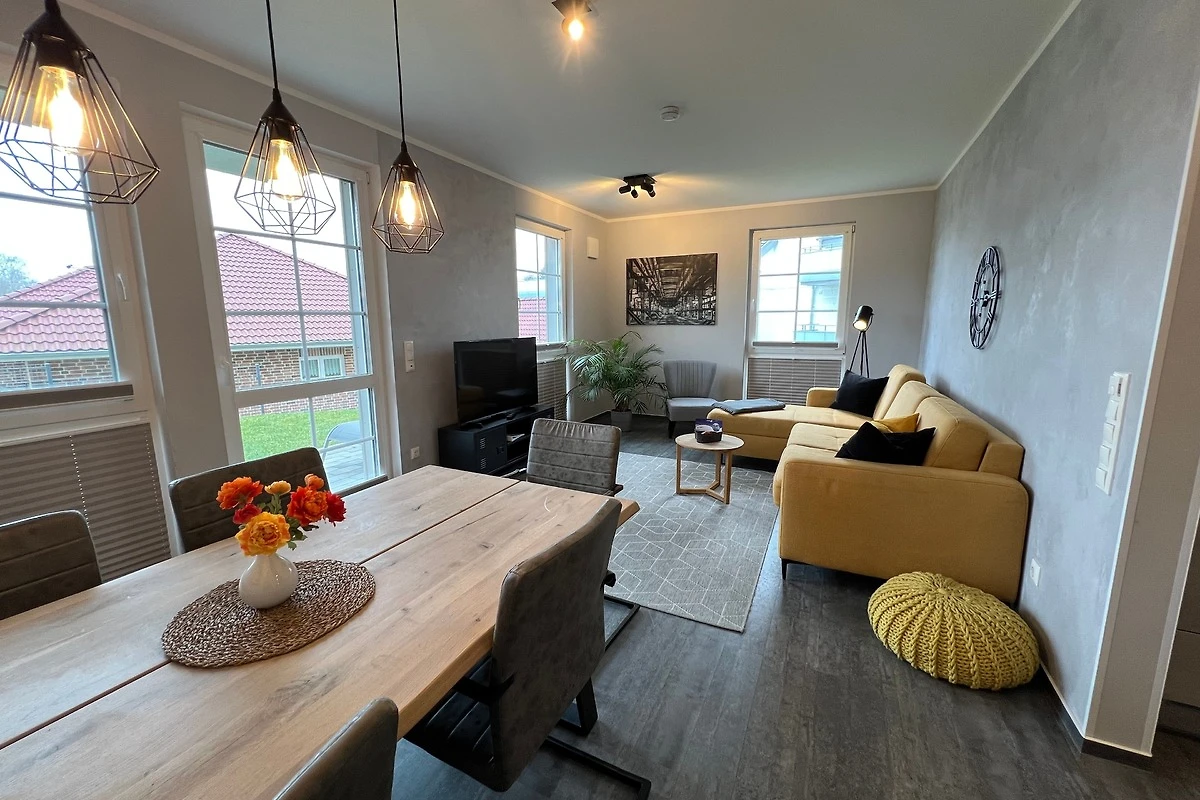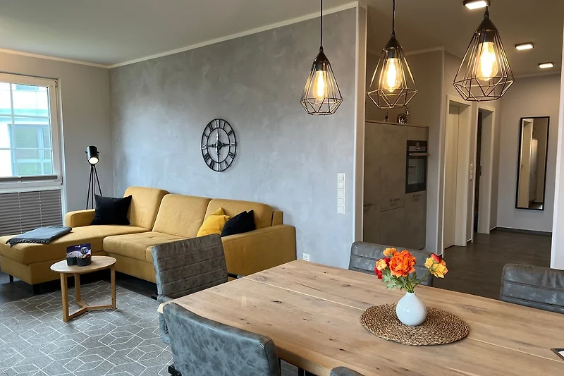 Die im Industrielook eingerichtete 71 qm grosse Ferienwohnung befindet sich im Erdgeschoss. Das Wohnzimmer ist mit einer hochwertigen Schlafcouch (160cm x 190cm) für weitere 2 Personen und mit einem grosszügigen Esstisch mit sechs Stühlen ausgestattet und hat direktem Zugang zur Terrasse. Die offene Küche verfügt u.a. über einen Geschirrspüler, einen Herd mit Backofen auf Augenhöhe, einen Kühlschrank mit Gefrierfach, einen Wasserkocher, einen Kaffeeautomat und einen Toaster.