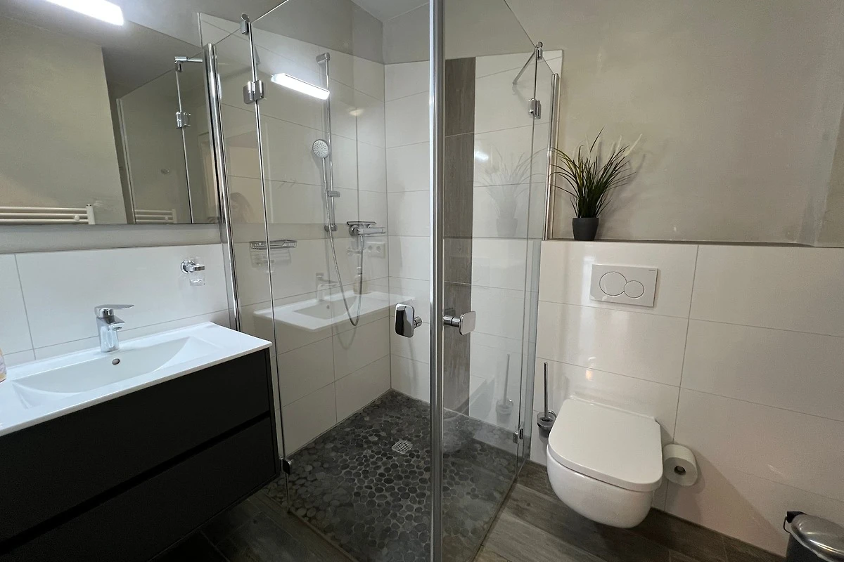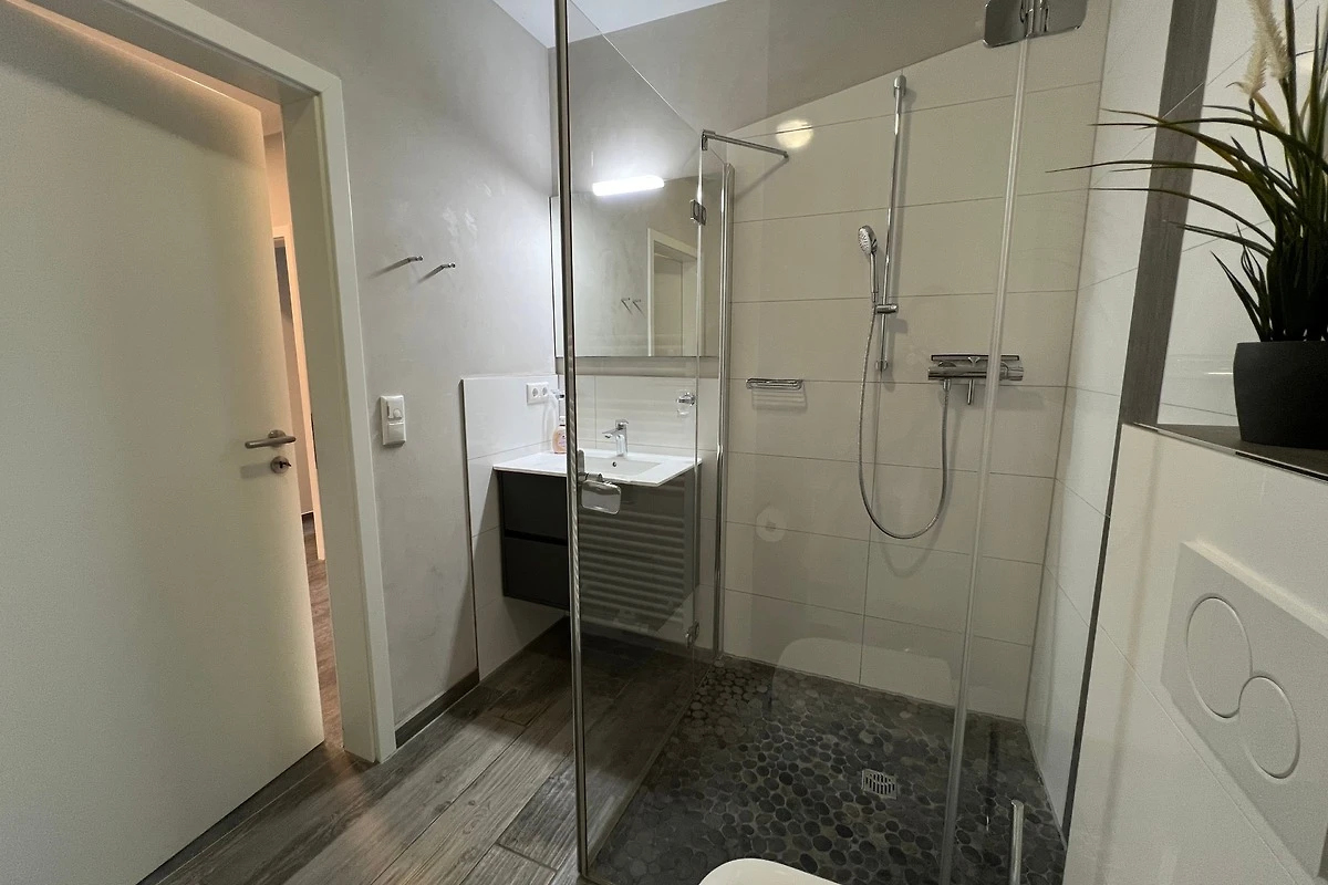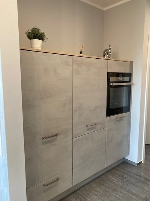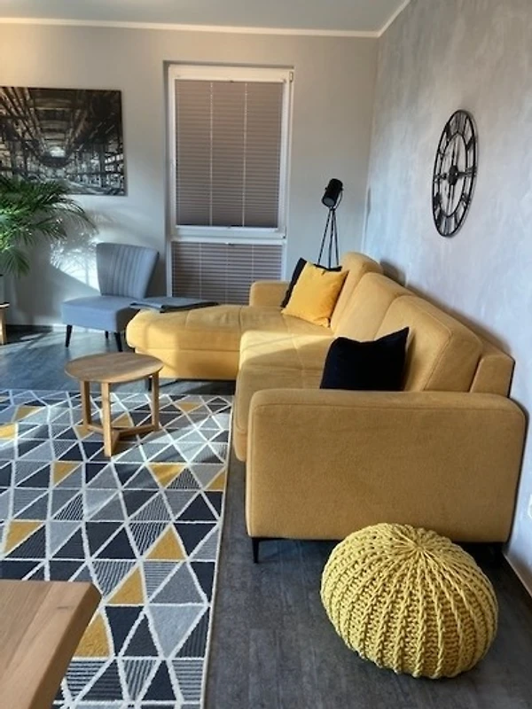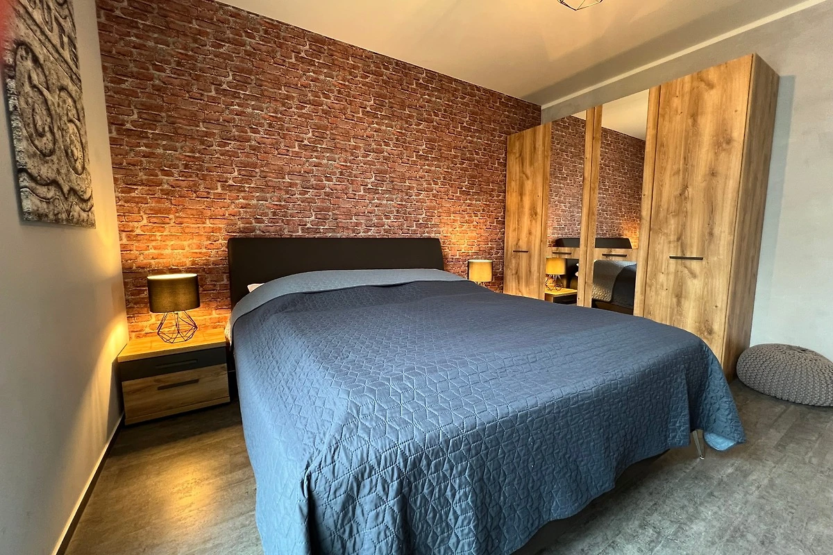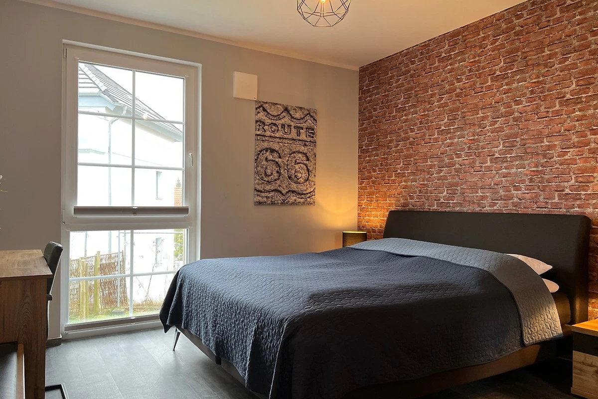 Die im Industrielook eingerichtete 71 qm grosse Ferienwohnung befindet sich im Erdgeschoss. Das Wohnzimmer ist mit einer hochwertigen Schlafcouch (160cm x 190cm) für weitere 2 Personen und mit einem grosszügigen Esstisch mit sechs Stühlen ausgestattet und hat direktem Zugang zur Terrasse. Die offene Küche verfügt u.a. über einen Geschirrspüler, einen Herd mit Backofen auf Augenhöhe, einen Kühlschrank mit Gefrierfach, einen Wasserkocher, einen Kaffeeautomat und einen Toaster.