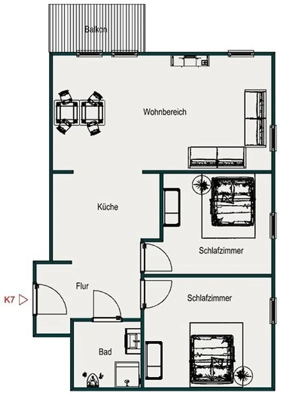 Der Wohnraum ist mit einer hochwertigen Wohn/Schlafcouch (Liegefläche 160cm x 190cm) ausgestattet und hat direktem Zugang zu einem ca. 10 m² grossem Balkon.