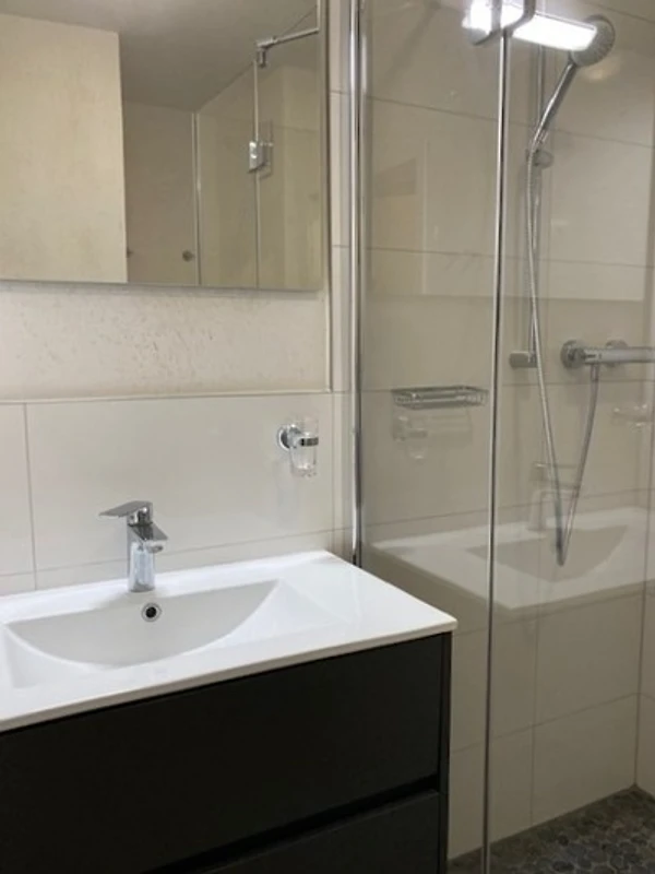 Das moderne Badezimmer verfügt über eine ebenerdigen Dusche, einen beheizbaren Handtuchhalter und einen Föhn.