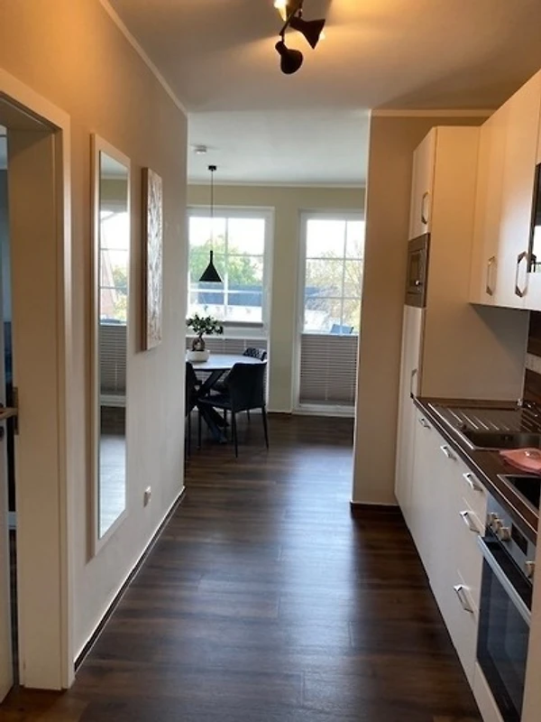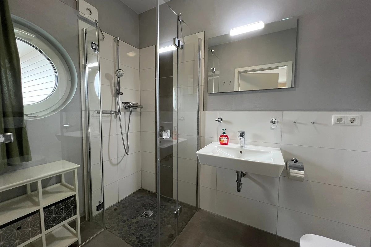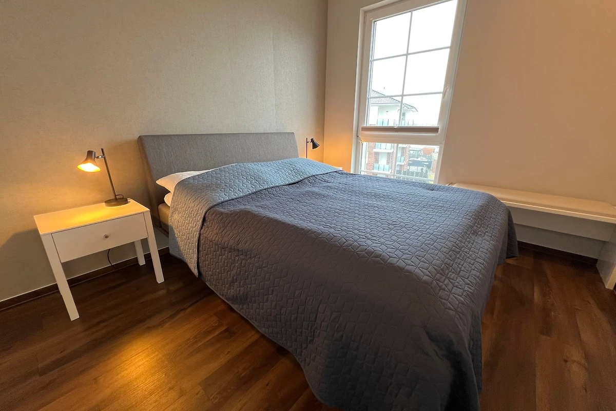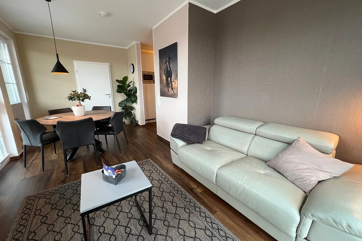 Diese moderne, in Erdtönen gehaltene Wohnung befindet sich im 1. Obergeschoss. Der Wohn/ Essbereich ist mit einer hochwertigen Wohn/Schlafcouch (Liegefläche 140 x 190 cm) für 2 Personen ausgestattet. Es stehen Ihnen eine moderne und vollausgestattete offene Küche sowie zwei separate Schlafzimmer mit jeweils einem Boxspringbett (180cm x 200cm und 160cm x 200cm) und einem Kleiderschrank für Ihre Garderobe zur Verfügung. In einem der Schlafräume finden Sie einen zweiten Flachbildfernseher.