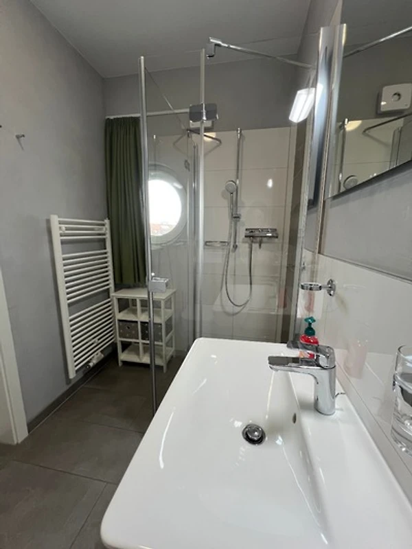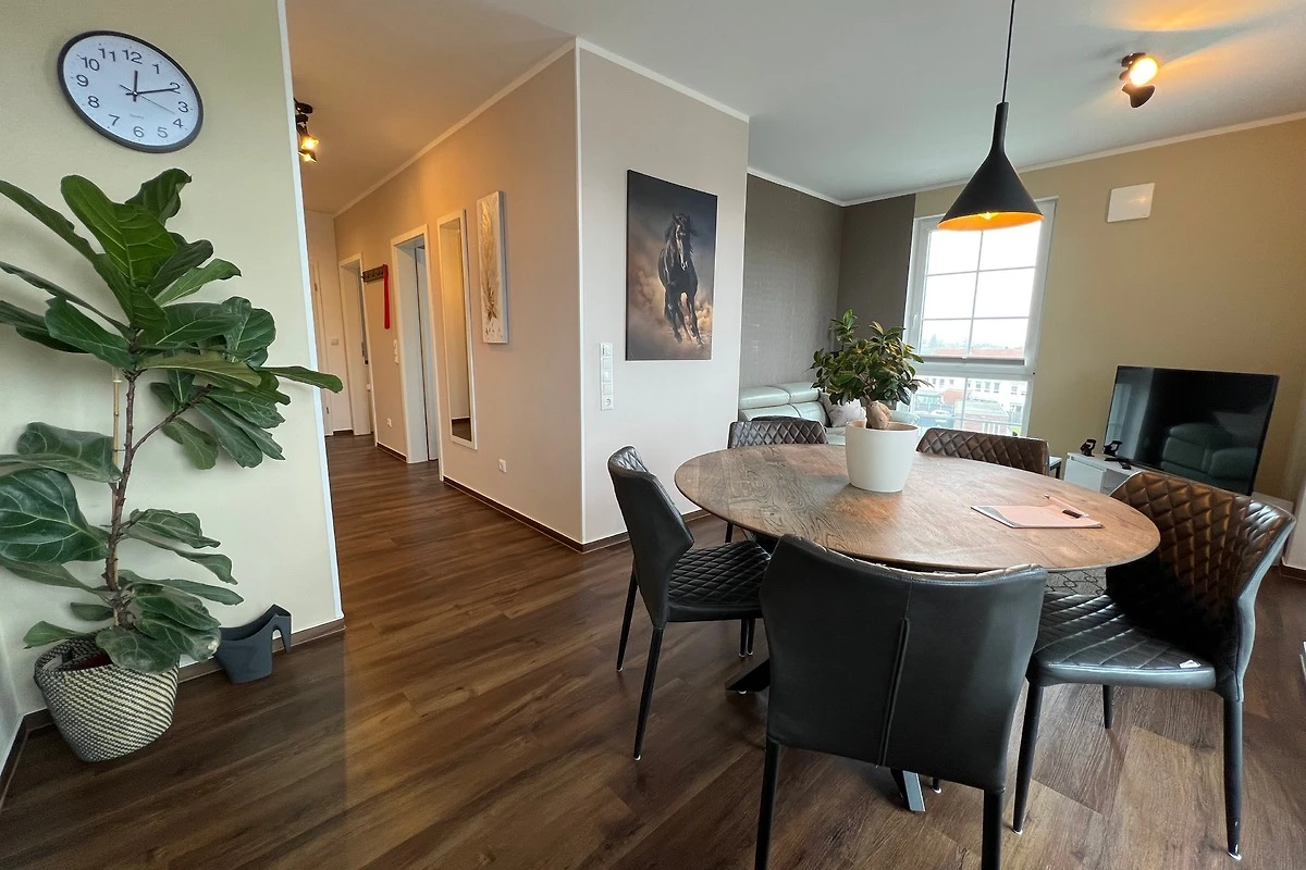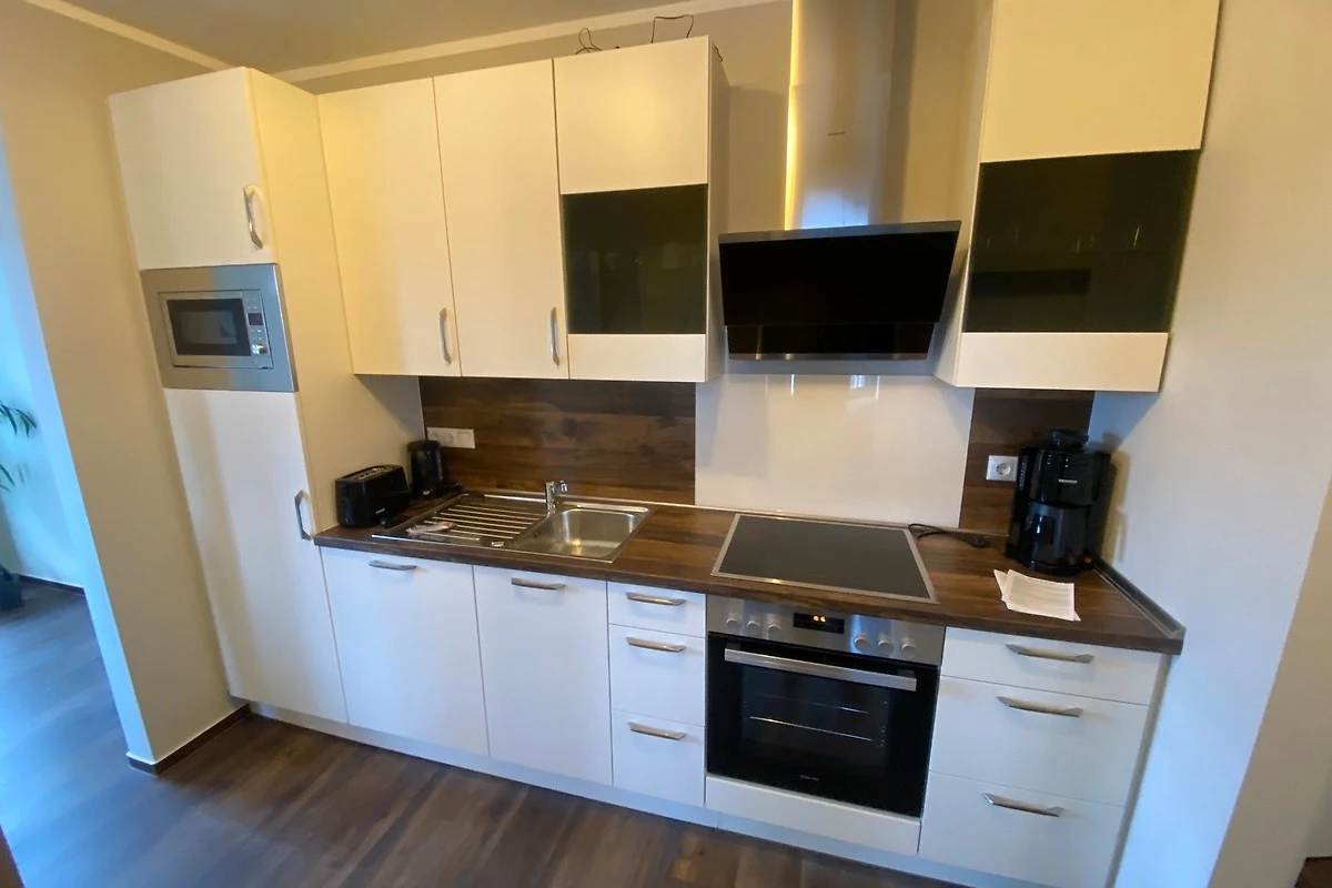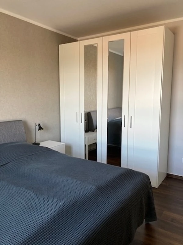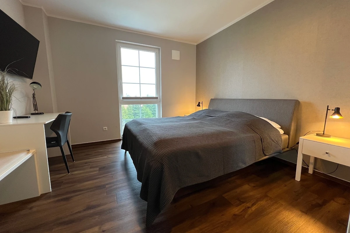 Diese moderne, in Erdtönen gehaltene Wohnung befindet sich im 1. Obergeschoss. Der Wohn/ Essbereich ist mit einer hochwertigen Wohn/Schlafcouch (Liegefläche 140 x 190 cm) für 2 Personen ausgestattet. Es stehen Ihnen eine moderne und vollausgestattete offene Küche sowie zwei separate Schlafzimmer mit jeweils einem Boxspringbett (180cm x 200cm und 160cm x 200cm) und einem Kleiderschrank für Ihre Garderobe zur Verfügung. In einem der Schlafräume finden Sie einen zweiten Flachbildfernseher.